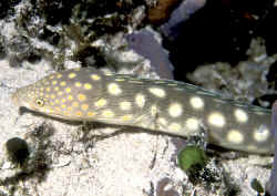 Highfin Snake Eel. Seen mostly in the sand by day. Darken with age,