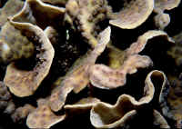 to the light Genus Oxypora Saville-Kent 1871, Scroll, Chalice Coral: Made up of thin encrusting or laminar leaf-like colonies whose edges have a small costal ridge. Costae have teeth like edge. You can see slits in the skeleton when colonies have flesh w/ drawn, light is shone through. Tentacles open only at night. Now part of the family Lobophylliidae Genus Pectinia Oken 1815: Laminar to branching colonies of