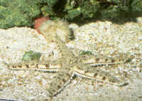 Selection: Specimens of several genera are commonly offered in the trade, and more unusual species may be special ordered through dealers. What to look for or look out for? The individual in question should be lively, moving and turgid-bodied, with tube feet visible in the case of Sea Stars. A good test is to turn the animal on its back and see if it rights itself. A limp or weak individual is a poor aquarium prospect. Some may eventually recover, but many do not. Most losses of these, and other spiny-skinned animals is subsequent capture and handling trauma. Other warning signs are dark or whitish necrotic matter and vacuolations (missing areas). Lost arms are common and will eventually heal over, but it is unwise to buy a specimen that is freshly wounded as infection and rapid decline may follow. Note: not at all rare are "comets", detached single arms that are regenerating new bodies. This is seen as a large arm with a small body and a set of small arms at one end. These are often very good specimens.