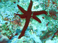 Echinoderms are notable as the only animal phylum with no parasitic members. They are hosts to many parasites themselves, however, particularly copepods and gastropods. You should check a prospective buy for any attached or obvious internal parasitic problems. Some Fave Groups, Species for Marine Aquarium Use: The most common error in selecting Sea Stars is acquiring species that get too large or are ravenous omnivorous predators. Not only will many species attack various types of reef invertebrates and fishes, they often can't get enough to eat even this way! Unless you are willing to make a special effort to house and feed the larger, predatory species, it is best to star with "reef safe" choices. Among the industry favored species are the very attractive Sand Sifting Star, Archaster typicus, the Little Red Starfish and Orange Marble Starfish (Fromia elegans and Fromia monilis respectively), Blue Starfish (Linckia laevigata), and Purple "Linckia", Tamaria stria. A note of clarification here: these are not necessarily the best suited species for aquarium use. "Regular" Linckias/Linckias in particular are generally short-lived. The genera and species below are our choices for most suitable.