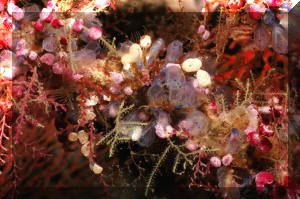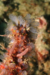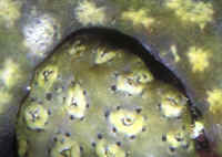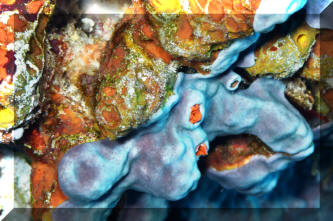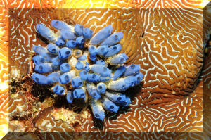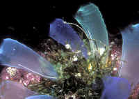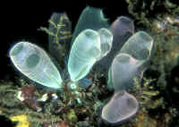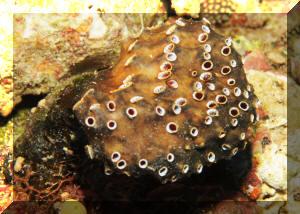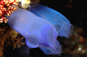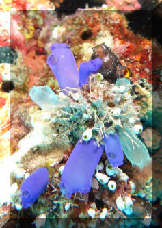 General Biology: Tunicates are made up of individuals termed zooids. The sessile (permanently attached, as opposed to the pelagic species) ones are attached to various substrates and have two siphons (incurrent, excurrent) in which they pump water through the gill net in their bodies. In fact, their ability to contract their siphons is the one easy trait to separate the ascidians from the at-times similar Sponges (phylum Porifera) which have permanent openings. The basic body plan of tunicates varies from simple to compound with single individuals clustering to degrees, to sharing tunics to having collective larger siphons in common within a colony. Simple ascidians may live only a year. Larger, colonial types may persist for several years. There are about two thousand described species. Range: Worldwide, in shallows to abyssal depths. Size: Zooids come in one millimeter to some five inches in length. Aquarium Husbandry: Most folks get their ascidians for "free" as explants with their live rock, though they can be procured through specialty shops and suppliers on the Net. They vary tremendously in their hardiness/capacity to be kept let alone propagated. Happily, many that come into the trade as "recruits" are not as sensitive to temperature change, edgy and changeable water quality et al. due to the sorts of environments their substrate is collected from. Selection, Acclimation, Placement: Like Sponges, ascidians should not be lifted into the air. Best to carefully place them with their substrate in a bag of just adequate size, with plenty of water, and in turn double, treble this with other bagging outside to support the inner bag. Some species sponsor endo-symbiotic species of algae, but many are cryptic, living in the dark or at least the shade. Careful observation of the other life on, near them will grant you insight as to what type of environment yours favors. You are encouraged nonetheless to provide plenty of water circulation about these animals. Foods/Feeding/Nutrition: All ascidians are plankton feeders. Well-seasoned systems with refugiums, not-over-vigorous skimming, and daily addition of phytoplankton preparations, blended (as in a blender) foods (either solids and/or liquids, and/or fresh/frozen material... plankton infusoria, newly hatched brine shrimp, minced worms, flakes, bivalve juice...), with the filter pumps cycled off (for fifteen minutes via timers is best...) are good ways of assuring nutrifying these animals. Symbioses, including Predator-Prey Relations: There are whole groups of crustaceans, worms and other phyla that make their lives with/in ascidians. Some are mutualistic, others tend to parasitism. Know that there are Sea Stars, Urchins, Crabs, Hermits, Snails (including some nudibranchs) and some fishes that are predatory on ascidians. Best to keep so-called "reef-safe" fishes, stony and soft corals, gorgonians, mushrooms, zoanthids, sponges, tubeworms and bivalves with these animals. BTW, folks with large marine Angels et al. feeders on Sea Squirts might save some money shopping for these foodstuffs in the Korean Foods section of your food store. Reproduction: These animals are hermaphroditic, possessing both functional male and female structures, but cross-fertilization is the rule, with sperm from one animal triggering release of eggs and subsequent fertilization by another individual. Additionally these animals reproduce asexually in a number of ways. Conclusion: Interesting? You bet... for such apparently simple, attached animals, the ascidians are complex animals with digestive, nervous, reproductive/developmental and circulatory systems (closed, with a heart, but alternating in pumping direction every few hours!) that point up their relationship with the "higher" chordates. Useful? Again, for sure. If you have healthy live rock, you assuredly have Sea Squirts. These cryptic animals are there, either too small, too camouflaged to be seen, or under, within your LR. Filtering away, keeping your water clean, perhaps adding their gametes occasionally to the mix of filter-feeding materials. You won't see their free-swimming young in your system, but if you look closely you will find these close relations to the vertebrates in/on your live rock. Bibliography/Further Reading: http://www.ascidians.com/ Marine Hitchhiker/Critter ID (Maughmer, Toonen, Tompkins) Allen, Gerald R. & Roger Steene. 1994. Indo-Pacific Coral Reef Field Guide. Tropical Reef Research, Singapore. Erhardt, Harry & Horst Moosleitner. 1998. Marine Atlas, v.3 Invertebrates. MERGUS, Germany. 1,326pp. Gosliner, Terrence M, Behrens, David W. & Gary C. Williams. 1996. Coral Reef Animals of the Indo-Pacific. Sea Challengers, Monterey, California. 314pp. Mercier, Annie & Jean-Francois Hamel. 1998. Tunicates. A crucial step in evolution. FAMA 3/98. Volkart, Bill. 1990. Sea squirts- tubular wonders. TFH 10/90. |
