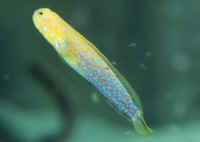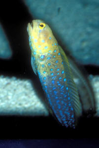 Distribution & Habitat: This fish is found in sandy (not really adjacent to rock) bays and open ocean areas from about the middle of Baja Mexico's Sea of Cortez, down to the tip (Los Arcos), which is where I first encountered it (Cabo San Lucas, at the Playa del Amor'¦ the "Beach of Love"), in 30 to 90 foot depths. The species is unmistakable in terms of coloration, markings and behavior. Juveniles are uniformly colored yellow with blue spots, females with dark-brown bodies and larger blue spots, and courting males being stark white in their anterior halves, blackish posteriorly during displays. Behavior: This is a very social species, with several individuals living about evenly spaced a meter apart from each other in offshore sandy areas in open ocean and bays, living almost entirely within their dug out burrows. Unlike the commonly available member of the family, the Pearly Jaw of the Atlantic (Opistognathus aurifrons) which spends a good deal of time out and above their burrows year long in the wild, O. rosenblatti males only display during warm weather (summer months), when competitions for females include a change in colour and hovering a few feet above their burrow openings. Compatibility: Due to their secretive life history, this fish is best kept w/o other fishes, and very little else in the way of livestock. They live in very open sandy or rubble areas, not necessarily near rocky reefs, with only occasional other fish swimming nearby. If you want to see yours any percentage of the time, maintain it/them in a dedicated set-up. If you do opt for other life presence, make sure it is easy going, slow-moving and not too competitive in feeding with your Jaw/s. Selection: This whole family ships exceptionally well, and the Blue-spot is almost always exemplary on arrival. Other than waiting for a day or so to see if the fish will die mysteriously, I would not leave this species at a dealers for any more time, nor would I quarantine this or any other Opistognathid. There's far more to be lost than gained in such delays; with stress and the very real possibility of the fish damaging themselves vs. the small likelihood of advancing biological disease. System: The size and shape of a system to suit the Blue-spot almost always goes unaccommodated by aquarists. Though this fish is small (most specimens are sold at 4-5" overall length) it really requires a large area of open expanse, AND width to feel comfortable. How much dimensionally? A good three feet of width between specimens and two foot plus in width of a good deal of mixed fine sand and rubble substrate. This last should be a good eight inches'¦ Now you say, "But I've seen/known other folks who have kept this Jawfish in smaller settings, crowded even with other fishes'¦". Maybe they were lucky, and very likely their Blue-Spot did not live very long or well. As if the call for grand size systems with none to few roommates, and bunches of sand wasn't enough, these fishes are not really tropical animals. That's right, they live in cooler water. The Eastern Pacific coast receives as part of the North Pacific Gyre (remember the Coriolis Effect?) the California Current off the coast of the United States and Mexico's two States/Estados of that name'¦ this is cold water propagating from the north (as in Alaska) down to about the equator, where it takes a gliding western turn, going back up north generally in the now much warmer Western Pacific Ocean as the Japanese Current. The practical implication is that water off the Californias is appreciably cooler than the same latitudes in the W. Pacific, with the habitat of the Blue-Spotted Jaw being mostly in the upper 50's F. to upper 60's, and rarely lower 70's F'¦. Brrr? Yes. Being an old/er timer in this interest, including the hobby, trade and sciences, I have seen a few cycles of cool to colder water organisms sold, or may I state, mis-represented as tropicals (Catalina Gobies, Garibaldi, Metridium and Tealia Anemones, Moon Snails, many types of Algae'¦)'¦ These won't live for long in too-warm surroundings and neither will this cool water Jawfish. Soooo, if you live in most anywhere you don't have to wear coats and sweaters, you will likely need to buy and run a chiller to keep this fish long-term. Foods/Feeding: There are Jawfish species that have a broader diet, consuming worms, crustaceans et al. infaunal material; the Blue-Spot is almost exclusively a zooplanktivore, looking for and snapping small animals in the water column as they float or drift by over their immediate territory. Ideally, you might have a good-sized refugium attached to your main display tank with the Jaw/s'¦ with a RDP (Reverse Daylight Photoperiod) arrangement for lighting it during the "off times" for the Jaw system. As much of the life in vibrant, established refugiums is nocturnal, some of this will be swept up and delivered to the main system on a periodic basis. Alternatively, providing small whole or cut up meaty foods into a jet/pump discharge a few times a day will work. Disease/Health: Small scales are not a problem as with other fish families where parasitic and infectious diseases are concerned. Jawfishes are remarkable in holding out as last to near last contractors of such, and typically don't suffer easily for treatment with the generally toxic to outright poisonous constituents of "fish remedies". Nonetheless, I urge you to take care in treating these and all other fishes with formalin, dyes like Malachite Green and metal salt solutions (e.g. Copper based medications); and instead opt for quinine compounds (e.g. Chloroquine Phosphate) if you find yourself having to treat for Protozoan complaints. Reproduction: Kerstitch (1979) reports the Blue-Spotted Jawfish to be a mouthbrooder like its common congener the Yellow-head of the Atlantic. Males display behaviorally and colour-wise in the summer months, dashing 3-4 feet above their burrows, trying to attract a female. If successful the female joins