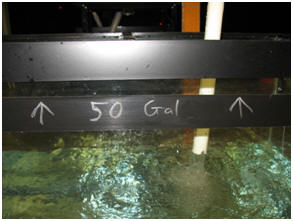 Method: To conduct these tests, we used two 65-gallon aquariums and a tank drilled for the different sized bulkheads. One of the 65-gallon tanks was used to pump water into the drilled tank, which then overflowed into the other 65-gallon tank. The aquarium being filled had a mark indicating 50 gallons (Figure 4) which was calibrated by first filling with a measured 50 gallons of water. We chose a pump with the ability to outflow the largest bulkhead, and controlled its flow to maintain the water level just above the top of the bulkhead being tested. The time to flow 50 gallons of water was timed, and then the flow was calculated through the bulkhead using the following formula: