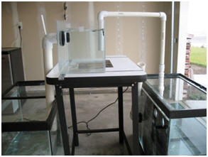 We repeated this a minimum of three times for each size bulkhead. A Megaflow tank was tested as well, as it is often a topic of conversation. It should be noted this setup included a water level 4” above the overflow inlet and used a Durso style standpipe. Unless otherwise noted, all tests were performed with a bulkhead through the back wall of the tank plumbed with a street elbow straight down 2 ½ feet to the capture tank. This test was conducted with fresh water. A picture of the testing apparatus can be seen in Figure 5. A note in regards to siphoning in the aquarium: Siphoning is an effect that occurs when the water traveling down through a sealed tube creates a vacuum on the upper end of the tube. This vacuum in turn pulls in more water, ideally keeping the vacuum going. We used a vented elbow to prevent siphoning in most tests, with an unvented elbow used to show the effects of siphoning in other tests. By aspirating (allowing air into) the elbow the siphon in these tests are broken, leaving a 100% gravity fed overflow. Some tests were conducted with full or partial (not the full duration of the test) siphons to demonstrate the difference in flow with a siphon. The drawbacks to using siphoning in overflow drains are discussed below.