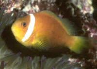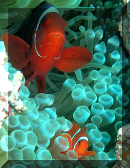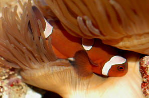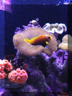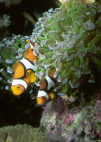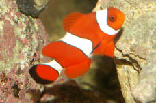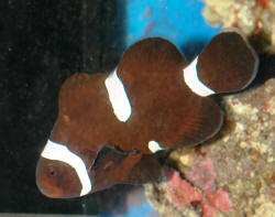 Size: Juveniles to sub-adults adapt much better to captive conditions. Some clowns, like Amphiprion ocellaris, may reach up to five inches in the wild. Optimum minimum small sizes for all species are about one inch for wild and three-quarter inch for tank-reared. Buying for Breeding: Stock purchased for breeding should be as for most species; buy and raise a group of smaller-than-mature individuals and allow them to pair off. Several species can be sexed externally when large enough, as the females are much heavier-bodied and/or differently colored. Usually when you get two clowns, if you buy one larger than the other, the larger one will turn more aggressive and become the female. For a discussion on structural and color differences and sex-changing (!) see Hoff 1984. Environmental: Like many organisms living in close association with invertebrates, Anemonefishes are sensitive to similar chemical and physical conditions and changes. Acclimating/cleansing dips should be used and be of short duration. Use freshwater with very little or no formalin, copper, malachite, et al.. A dip, not an extended bath. System temperatures should be in the mid to high seventies (F.) with specific gravities of about 1.023. High water quality, especially keeping low levels of metabolites (proteins, albumen, phenols, nitrogenous compounds, etc.) are advised. Suitable bio-filtration, protein skimming with or without ozone & frequent partial water changes are the rule. Behavior: Territoriality: Anemonefishes can be overtly territorial, in particular where any threat to their host anemone is concerned. It is suggested that they be introduced with their host anemone after other fish tankmates, or provided with their own system. If your clown fish are very large and you want to try adding new specimens; disturbing/re-arranging the physical environment, extra-feeding and a watchful eye for problems are advised. Most other species of fishes are left alone as long as they are previously established, larger or more aggressive, and do not bother the Clownfish's anemone or come too close while the clown's are breeding. Anemonefish can and will attack you and draw blood if so inclined. Large non-paired adults generally do fight in all but the largest aquaria. Likewise, mixing species of all but juvenile sizes is chaotic. Keep them in separate systems. To reiterate; aggression can be intense amongst and between species of Anemonefishes. They lock jaws and "bite" each other cichlid-like. To reduce agonistic behavior, provide adequate size quarters, a number of anemones, be leery of mixing sizes and sexes and restrict your collection per tank!. If you want to try mixing adult species, make sure each pair has a large anemone, so they won't fight over anemones. Breeder pairs of some species are kept in ten to twenty gallon systems commercially; yours should be much larger. Symbiosis with Anemones: Do they really need an anemone? No, none of them; all have been kept and a few species spawned sans coelenterate; but some species do better then other's in an anemone's absence. A. melanopus, A. frenatus and A. biaculeatus are my top three for toughing it out without their "pals". However, chances of keeping and breeding Anemonefishes in captivity is greatly improved in the presence of host anemones. The mutually beneficial behavior of clowns and anemones has been well documented and popularized (see Thomas 1978), as has methods of selecting healthy symbiotic anemones. We'd like to reinforce a few points: