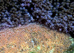 Many species of anemones are unsuitable. (e.g. Condylactis species from Florida, Atlantic carpets). Your clownfish may not easily chemically/physically introduce/communicate/consort with their intended hosts. They may even (gasp!) be consumed by, not with, them! Some Anemonefish species and individuals of larger sizes do well without anemones, though it has been speculated that they play an important role in removing external parasites besides providing shelter and protection from predators. Breeding: Has been a hot topic & covered well elsewhere (Goldstein 1982, Young 1984, Branowski 1985, Lindner 1986). Suffice it here to write that Anemonefishes breed a lot like substrate-spawning neo-tropical cichlids; by cleaning a rocky smooth surface next to or under the base of their host anemone. They deposit eggs, mouth, guard and fan them. When they become free-swimming, the fry are dispersed like planktonic zooplankters. In captivity their planktonic fry may be fed exclusively on marine rotifers which are easily hatched from eggs. They reproduce throughout the year, laying a few hundred to a few thousand eggs about once a month.