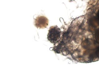 black 'filaments' covering their surfaces. The second microscope image is of a