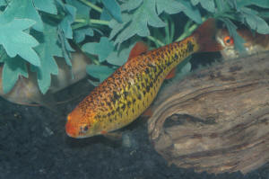 Type of Catfish Compatible with Rosey Barbs 1/5/08 Hello, <Hello Vera,> First of all, thank you for being such a wonderful information source! I've been reading the web site for some time now although I cannot find any exact advice regarding my issue. <Oh...?> I have a 14 gallon tank with 4 Rosey barbs that has a brown algae outbreak. Two days ago, I returned home to find the heater "cranked up" to 90 degrees F. Luckily, the barbs all survived but the brown algae is becoming worse. <Hmm... 14 gallons a bit small for Rosy Barbs (Puntius conchonius); maximum size is 15 cm/6", though typically only about half that in aquaria.> I purchased an Emerald Corydoras but the barbs attacked him so bad that I moved him to another tank with 3 bronze Corydoras. <Very unusual behaviour. Usually these barbs are quite well behaved. Ordinarily, I'd expect subtropical Corydoras (e.g., Peppered, Bronze, Bearded Corydoras) to do well with Rosy Barbs.> Do you advise getting an algae eater for this issue or attempting to treat the algae. <The easiest way to treat algae is to improve the growth of live plants by adding more light. Floating plants are easiest for this, but any fast-growing plants will do. Algae-eaters generally have moderate to no effect, and in the long term only increase the pollutants in the water, helping algae grow faster. Besides, your tank is a bit overstocked already.> I have performed a 50% water change; and turned the temperature down to 76 degrees F. <Too warm: these are subtropical barbs. Aim for 20C/68F.> The tank has plastic plants, a resin tree stump, a "real" rock from an established tank and light colored medium river stone. Thank you so much for the assistance!! Vera Have a good day! <Happy to help. Cheers, Neale.> Barbs, comp. Child 11/06/07 dear WWM crew. I have emailed you about the guppies a lot .I figured that out but just want to know how to cure something that seems like fin rot. also I have read online that you need to keep 4 to 6 cherry barbs together. are there any other barbs that you can put with a cherry barb to make up the school of 6. thanks. <Greetings. When creating groups (schools) of a certain species, you have to use the same species. That's the whole point. If I put you in a motor car with a chimp, a gorilla, and a gibbon, there wouldn't be a group of people in there. There'd be one person plus three different kinds of ape. So if you need a group of six Cherry Barbs (Puntius titteya) then you need to buy six Cherry Barbs, not two Cherry Barbs, two Tiger Barbs and two Spanner Barbs. All this said, I've never considered Puntius titteya a schooling species; it seems to be more of a territorial loner. So unless your specimens are obviously unhappy (e.g., not eating, or very shy) then I wouldn't worry about it. As for curing Finrot, the cause and the cure are usually quite simple. Finrot is caused 9 times out of 10 by water quality issues. Check especially nitrite and, in the case of Guppies, hardness. Guppies need nitrite/ammonia-free water and the water must be hard and alkaline. Cheers, Neale> Angelfish not Compatible w/ Barbs... - 10/18/06 I purchased a medium sized silver angel fish from a reliable fish store a few days ago. <OK - hopefully you quarantined it, even though you find the store reliable...> The first day it looked stressed; difficulty maintaining balance and swimming. By the second day, its balance and strength seemed to improve. It's now the third day and I expect any minute to see it floating. It's been hiding much of the time behind the strip thermometer in the front of the tank. I haven't seen it eat although I provide a variety of food for it (dried blood worms, color bits, shrimp pellets and flake food.) I also have five bleeding heart tetras, six red platys, a rope fish and a few feeder sized guppies. All of the other fish seem happy. <Have you recently tested the water parameters? I'd start buy finding out what the ammonia, nitrite and nitrates are at, along with pH. Also, when you put the fish in the tank, did you slowly acclimate it, or just immediately release it in the tank?> Would a partial water change/gravel vacuuming stress it out more? <Depends on your water parameters - generally, water changes are never a bad thing, however...> What about moving it to another tank (10 gal) by itself for a while? <You should have done this initially. If the fish was harboring some sort of disease, it's now been introduced into your main tank. If the fish still isn't acting well, I would quarantine it ASAP, though. Make sure to provide hiding places (plants, decor, etc.). Also, in the present tank, have you been able to observe if any of the older inhabitants are picking on the new arrival? Especially the barbs - they can be very fin nippy, and the angel, with its beautiful fins, could find him/herself being bullied, which obviously would cause stress. In all reality, angels and barbs should not be housed together.> I called the store where I got it (in a tank by itself) and they said it was healthy and eating well there. <What else would they say?!> Out of the four angels they had, this one seemed most active when I bought it. Now it just hides. <I think you have an incompatible mix of fish here - you will likely have to find a new home for the angel...with peaceful tankmates, not aggressive ones, like barbs.> I have plenty of plants in the tank, but it seems to prefer the thermometer. What should I do? Will it eventually get used to its tankmates or is it more likely to starve to death? <Incompatible. Either set up a suitable species / peaceful community aquarium for the angel or return it to the fish store. Do make sure to research species compatibility before purchasing...check out A Simple Guide to Freshwater Aquariums by David E. Boruchowitz if you haven't yet...> <Good luck, Jorie.> Jorie Misread Last Email - Apologies All Around. Angel Fish with Tetras... - 10/18/06 I don't have any barbs unless they go by a different name. The 29 gal ta