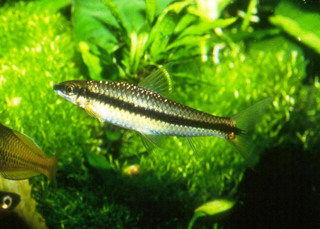 Goldfinned Barb. Southeast Asia. To a little over three inches in
