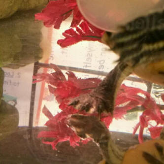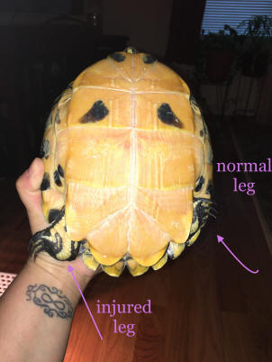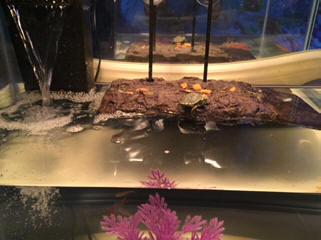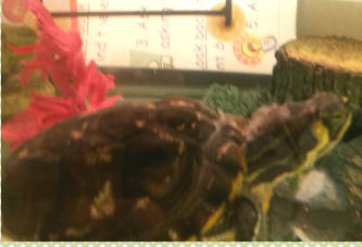 fish treats. The bottom of his shell has pinkish areas that his previous owner