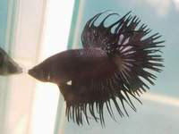 for awhile instead of setting up an entire new tank.-Chuck> Siamese Fighters 8/2/04 Hi Robert, <<Or Gwen :)>> Some advice please!. My son has recently had to return Simon the Siamese fighter from whence he came as he was slowly devouring (haranguing to death to be totally accurate!) all of my daughters much, much loved and named guppies ( male). However he did so with head hung low and with a sad heart as he and Simon had grown close this last ten months. I was so proud of him as he offered to do the deed to save his 7 yr old sisters feelings, he is though himself disabled and though money is tight I am thinking of re-claiming Simon as a surprise for my son. Do I have to go to the expense of acquiring another tank to home him, or can he be cured of his psychopathic tendencies? I look forward to receiving your pearls of wisdom! Many thanks and kindest regards, Louise. <<Louise; I doubt Simon can be cured of his "tendencies"...:P Unfortunately, fish can be quite aggressive and territorial, and Simon appears to be both. You can keep Simon in his own small bowl, however, as long as you change his water frequently. The smaller the bowl, the more often you will need to change the water. Bettas do not require filtration, but he will require clean water, good food, and the occasional bout of interesting conversation with his owner :P -Gwen>> Water Frogs with Bettas I have a Betta fish named Gamma Ray Pigfish. I was worried about how bored he might be in his little tank, so a coworker of mine gave me an aquatic plant, and a small aquatic frog a few weeks after the plant. Gamma has done just fine with the plant, but he and the frog (Frogger) did not get along at all. I finally separated them after a day of Gamma trying to nibble on Frogger's feet, and Frogger finally latching onto Gamma's back tail fin and not letting go. My coworker assured me that they get along, since she bought the frog from a mall stand that was selling both Bettas and the frogs. So, my questions are: What kind of frog is this? Does it really get along with Bettas? What the heck does it eat? Basically, how do I care for it? The frog is very small -about 1-2" long. He is slightly green on top, and whiter-green on bottom. He has tiny front legs, and delicate webbing between each toe. He seems to enjoy spreading his tiny body near the water surface, and floating there like that. I wish to keep him, separate from the Betta, but do not know what container to keep him in, what food he enjoys, what things to possibly put with him in the tank, etc. < Sounds like you have a floating frog. They float on the surface eating small insects that fall into the water. They appreciate an area where they can get out of the water. Frogs are always hungry and will eat anything they can get into their mouths including betta fins. A little terrarium that is half sand and half water will work just fine. Crickets and mealworms are easily purchased at pet shops. You can get a better idea of the terrariums that are available at your local fish store or pet shop.-Chuck> Thanks, Chelsea Betta not feeding, but being fed on hi guys, <Hi! MikeD here!> I'm new on this website and I noticed a few things I had no idea about my Siamese fighter, but talking about him I am getting increasingly worried as I have had him around a week with some other fish {because my water was fine so I could get some more} but I have not seen him eat. All my other fish swim to the top and grab the flakes but he just stays in his area not even looking at the food. <<Bettas don't really "like" flake foods, need more substantial, meatier foods to be healthy. RMF>> I have also seen that he has lost a chunk out of on his fin and has lots of little bite marks were it looks like the end of his tail has died off!<That's likely what is happening. Many fish, such as tetras and barbs are well known fin nippers that keep biting that tale.> I do know that they don't like new tanks but I can't stand to see such a beautiful creature suffer! My friend has lent me a special like sick box to put him in with a pea<Why a pea? I can see no reason a pea would make any difference at all, other than to decay.>> to make him better is this right? In my tank I have 1 neon tetra, 1 albino shark, 1 catfish, 2 female Siamese fighters, 1 silver tetra, 2 sail fin mollies, 2 mollies, and two others that I can't spell, but any way do you think they are the problems<Yes. Many of these fish, including the female Bettas can and will attack the flowing fins of a male Betta. He's probably staying in that corner in hopes of building a nest to attract a female, or else he's hiding there for self protection from whatever is attacking him. Often male Bettas do not make good community fish residents for this very reason. My suggestion would be to remove him to his own aquarium.> is it the filtration system that might be sucking his fins in cause that is were his area is!<No> please help from Amy Why Can't They Get Along Good morning crew, Thank you for such a great website. I have a 30G planted tank with 1 male Betta, 3 Corys and 5 cherry barbs. Everyone gets along well except my Betta and the 3 Corys. I know that bettas are territorial, but I thought only with other male bettas. I also thought, possibly mistakenly, that since a male Betta would probably inhabit the top of the tank, my 3 bottom dwellers would be perfectly fine...at the bottom. Apparently, my Betta has annexed the front bottom corner of my tank, while the 3 Corys enjoy the adjacent back corner under some green Cabomba. Every once in a while the Corys swim to the front corner to eat and frolic. The Betta, who doesn't like this at all, seems to hide close to some rocks and plants in order to ambush the Corys. The Betta routinely shows his gill membranes and while not always nipping at the Corys seems to always whack them with his tail fin (which really freaks the Corys out). Why don't the Corys move to the other side of the aquarium (where in my opinion there 