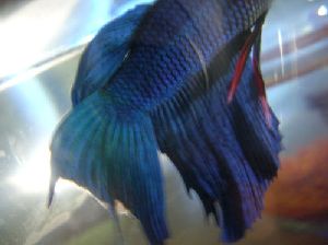 G.> Rod-like fins on Betta Hi Robert, <Nelly... my mother's name...> I have a sick Betta with rod-like fins and tail. (As far, this is the best site I found). <Yikes... sounds very much like "Anchor Worm"... a copepod parasite... please see the pix here: Yucky Anchor Worm> About ten months ago I got 3 male Bettas: blue, turquoise and purple. The blue one (the most beautiful) died soon after I got them. The fins and tail looked rod-like. When I showed the sick fish to the man in the pet store from where the Betta came, he told me that he never seen such a disease. However he suggested trying BettaFix which I did with no results. <Mmm, no... a sort of anti-microbial... not useful against metazoans... you want an organophosphate (yes, like the insecticides)> Then after a few months the purple Betta was in the same condition. I had Melafix by that time and after only one treatment she was fine. Miraculously the fins had opened again like a mantel. At that time I was not aware that BettaFix and Melafix are the same thing (Melaleuca-or tea tree oil) only in different concentration, so you need more drops from the weaker solution. <Yes... both Aquarium Pharmaceutical's products> Now the turquoise Betta is sick for about 2 weeks with the same symptoms. None of the BettaFix has helped him. He eats does not get better. He does not move very much around and his color is fading. I do not think this is fin rot because the fins are there [and] he just [can't] open them. I keep each Betta in one-gallon cylindrical glass container, use Aquarium salt, Stress Coat Water Conditioner and change the water frequently, so never gets polluted. The temperature is in the high 70s Fahrenheit. There are not small heaters on the market to be used for 1-gallon container, but I have underneath a heating pad that provides the right temperature. <Good> The water test shows ideal for pH, Chlorine, Ammonia, Nitrates and Nitrites. To reduce the amount of the stress I also have a piece of cardboard between the glass vases so they fight only when I remove the cardboard. I think that in nature they fight, but only if there is an intruder (which can not be all the time). <Good move> Is it possible to identify the disease by looking at the photo in the attachment? <Mmm, the attachment would not load through Hotmail... Argggghhhh... Would you kindly try re-sending it to here, the WWM mail server?> I have showed the picture with the sick Betta to people in several fish stores around and nobody knows about it. What should I do to save this courageous boy? <Treat with Dimilin, DTHP/Masoten/Dylox/Neguvon... these active ingredients... IS sold for pet-fish use by several names...> Thank you so much for you comprehensive site. Nelly <Getting better by bits and pieces. Bob Fenner> My fighter is ill I have a blue fighter fish. He has a large