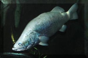 Lates calcarifer (Bloch 1790), the Barramundi, Silver "Datnoides". Indo-West Pacific; eastern coast of Arabian Peninsula to China, Southern Japan, New Guinea, Northern Australia. Brackish water as young, switching to all fresh at about a foot in length/time. To two meters long and sixty kg. Important food and game fish. Diadromous; living in freshwater, returning to estuaries to spawn. This five foot one in Phuket's Public Aquarium. Cute, good looking as brackish 3-5 inch aquarium specimens, but grow quickly.
