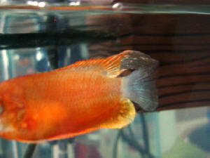 <Uh-oh! The Gourami with the orange-red tail is