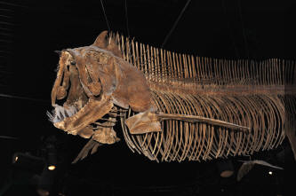 Do you really like fish? I mean really; are you a true a A Fish E Ah Nay Dough? Well, if aquatics are your passion, this, The Story of the Coelacanth (actually the title of a book by Keith S Thomson) is for you. Maybe just a smidgen from it: (p.133) "Nature always has a few ringers of course- like ducks that next in trees, kangaroos that climb trees, or fishes that walk on land. In fact, fishes alone are so diverse that we can point to the climbing perch, the flying fish, and the walking catfish... We can reconstruct a lot of the behavior and even physiology of an organism from incomplete evidence, such as the skeleton or a fossil, without ever seeing the whole living organism or being absolutely sure we are right. Putting it more scientifically, we can make a number of hypotheses and hope to test them more fully as the direct evidence slowly comes in. Strictly speaking, you can never "prove" hypotheses; what scientists actually do is try to amass more and more data that will turn out either to corroborate or refute their hypotheses. This makes science a lot of fun"... Couldn't agree more Hey, here's your big chance to get a copy of J.L.B. Smith's coelacanth wanted poster, maybe get pumped up and join S.P.O.O.F. (the society for the protection of old fishes, I'm not joking), and learn such great humor as; "Why did the Eusthenopteron cross the road? To become a Lissamphibian" Ha Ha, Ho Ho, no, stop, I'm slaying myself. Cause just what the heck is that thing? The/A Missing Link? Well, no, and yes, a little. Well read on! Classification: Taxonomy, Relation With Other Groups Oh boy, where to begin? There is but one species of living coelacanth (known), and maybe fifty acknowledged extinct varieties. This is therefore a monotypic genus, family, order... but we're getting ahead of ourselves here! Let us start again and try to put this critter in it's place and time: For review, our favorite group of vertebrates (fishes) occupy three of the seven living classes of vertebrates, the other four (tetrapods= four feet) being the amphibians (frogs, toads, salamanders, newts, caecilians), reptiles (lizards, snakes, crocodilians, turtles, the tuatara), birds and mammals. According to most popular/generally accepted arrangements there are/were two other extinct classes of vertebrates (fishes, yeah!). The minute placoderms and ostracoderms; but I digress. Ahem: Perhaps something along the lines of the filter-feeding, jawless ostracoderms "gave rise" to the also jawless fishes (Class Agnatha) represented by their "degenerated descendants", the living hagfishes and lampreys. As the story goes, some stem line of the Agnatha led to the Class Placodermata, which went extinct, but also led to the cartilaginous fishes (Class Chondrichthyes), the sharks, rays, skates and the weird chimaeras. Oh, and some of the placoderms went on to become the rest of the bony fishes (Class Osteichthyes). Now, pay close attention here. We're going to skip/gloss over the various sub-divisions of the advanced and not-so advanced bony fish types (teleosts, etc.) to focus and chat about the group at hand and it's affinities. Along the way to changing into extant forms the placoderms also gave rise to the lobe-finned fishes, the Sub-Class Crossopterygii (boy, that's a hard one to say), which in turn is the stem group that gave rise to the (tah-dah!) order including the family Coelacanthidae and the Order Rhipidistia. These rhipidistian fishes are all gone, but they resulted (sort of teleological eh?) in the living lungfishes, amphibians, and the rest of the tetrapods. Whew! Before you start to sing the words to "Say You Will", "You make me want to throw my hands up and shout", let me (and Dick Boyd, artist of FAMA) present a pictograph of these relationships: Class Ostracodermata: Muck suckers from before the Devonian, giving rise to the Class Agnatha led to/include the living jawless fishes and the Class Placodermata which are extinct, but led to the Class Chondrichthyes and the Class Osteichthyes including the un & advanced so bony fishes &
