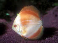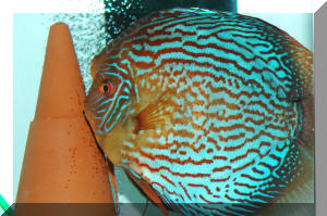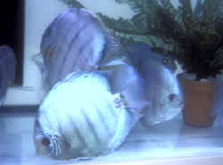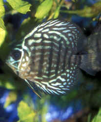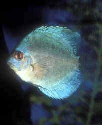 Maintenance: Foods/Feeding: Other than water quality, the second most important aspect of discus keeping (well, vying with social arrangements) is nutrition. There are many do it yourself formulas for making formulated discus food'¦ calling for grinding, blending beef heart, gelatin, peas'¦ many more possible ingredients, as well as quite a few very good commercially prepared foods. These include frozen, freeze-dried, flake and even pellet varieties. Once you get your fish accustomed to whichever brand, format, it's best to stick with this. Do take care in dealing with "live foods" of freshwater or even sewerage origins'¦ Worms (Blood, Black, Tubifex) can be trouble in particular. I do not endorse the use of live freshwater source foods period. Best to offer these freshwater source foods in frozen/defrosted formats, even ones that have been gamma-radiation zapped. Know that discus do go on "hunger strikes" at times, often for no apparent reason. At these instances, it's always a good idea to check ones water quality, effect a good-sized water change, possibly raise the tank temperature, and offer some different variety of meaty foods. Very small discus should be fed several times a day. Even the largest of discus should be fed at least twice daily. They can/will learn to take food from your hand, but initially, foods may best be accepted if they are sinking'¦ as discus feed from the bottom mostly in the wild. Water Changes: With a bit of planning, a few specialized tools (a dedicated plastic trash can and lid, test kits, a pump or powerhead'¦) taking care of your discus tank/s can be reduced to a few minutes per week. The most important aspect of their regular maintenance is attention to preparing, storing and making requisite water changes. Symphysodon are particularly sensitive to an accumulation of their own (and others) wastes, and thus, in addition to providing plenty of volume (for dilution), careful feeding and filtration, frequent partial water changes are de riguer. New water is vastly better having been made-up and kept in a separate container for their use. This is where the trash can and cover, pump, heater'¦ come into play. If at all possible, locate this menagerie near the tank for ease of use, develop and adhere to a system of "making" new water after using that which was stored previously. For some lucky folks with relatively "clean" tapwater, this might entail simply using a hose to dump water in their "water change bucket" for next weeks use'¦ But for most people some steps will need to be employed to lower overall solute concentration and lower pH. Again, depending on where you're starting from source-wise this can be a simple matter, perhaps just adding a pH depressing product or a box filter of boiled peat moss wedged between filter "wool". For folks with "liquid rock" tapwater of high hardness (more than 20 dH) and/or TDS (total dissolved solids) in the hundreds of ppm, you'll be best off investing in an inexpensive reverse osmosis or deionization system for making your change water. Ideal set-ups for discus involve continuous "drip" water change mechanisms, but practically speaking, weekly change outs of fifteen-twenty percent are about prime for hobbyist systems. Breeding: Early attempts at discus breeding incorporated separating parents from their valuable eggs'¦ a mistake as the young feed on their parents prolactin-induced secretocytes (specialized cells) as an initial source of nutrition (not actually the parents body slime). The author was fortunate to have a pair of wild blue Heckel discus spawn for him back in the mid-sixties, but most folks will take the far easier route of starting with tank-bred specimens. There are some general "rules" concerning sexing discus (females are rounder in body shape, males more elongate'¦), or you can try closely observing their interaction in groups, hoping to "guess" at a pair at your dealers, but it is strongly suggested to purchase and raise a goodly number (six or more) individuals at a small size (less than mature) and allow them to sort themselves out. "Pairs" in stores and home can be two females'¦ and often first spawnings are non-fertile even with a male and female. There are many variations on the theme of spawning discus commercially, with some folks/companies opting to separate eggs with wire mesh or totally from their parents, raising them with Methylene Blued water, an airstone'¦ even protocols for early foods other than parental slime (See Wattley's accounts). Pairs of discus lay and fertilize their eggs on a vertical surface, a plant leaf, aquarium wall or purposeful spawning medium. At typical aquarium temperatures (low to mid-eighties F.) the young hatch out in about 3-4 days and are moved about by the parents. At six days or so they commence to "contact feed" on their parents sides and fins and continue to do so for about two weeks. After this time, numerous (several times per day) of small live food (often newly hatched brine shrimp) must be offered to sustain the young. For commercial purposes the young are separated from their parents, speeding up their time to next spawning (typically a week to two weeks). Diseases of Discus: Environmental: Problems like too-bright lighting, poor/unsuitable water quality (generally not warm enough, too hard/alkaline) and too much human traffic about their system are often make that way-too-often a source of over-stress for captive Symphysodon. Even relatively "plastic" sports require low lighted, quiet settings with attention to warm, softer water conditions. Many "disease" problems with discus can be solved via environmental manipulation. Lowering pH between 5-6, and raising temperature (to the upper eighties F.) will often affect a "cure" for ailing Symphysodon. Of course, you should look for and remedy any "root causes", such as poor water quality otherwise, a lack of maintenance or gear failure. Otherwise, the old saw, "when in doubt check water quality