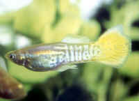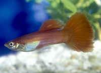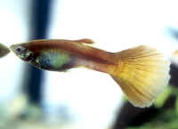 Besides colours, breeders have created guppies with modified dorsal and tail fins. Veil-tail forms are especially common. These guppies have long flowing dorsal fins and tail fins that are two or three times larger than those of wild guppies. One problem with these veil-tail forms is that they are simply not as good at swimming as guppies with normal-sized fins. This causes problems for them in tanks with strong water currents and also at feeding time, when they find it difficult to compete with regular guppies. Veil-tail fish are often targeted by nippy tankmates such as tiger barbs and Serpae tetras, and even species not usually considered fin-nippers, such as angelfish and Synodontis nigriventris, have been known to nibble on these slow-moving guppies. As well as veil-tail forms, there are guppies with single or double sword-tails, pin-tail guppies, and round-tail guppies. The popular delta-tail guppy has a large tail that is similar to the veil-tail in size but instead of being rounded is a neat triangular shape. Ender guppy varieties Wild Endler guppies are found in a number of different forms. The variety found in the Campoma lagoon and its immediate surroundings is the standard form. Males are silvery-white with red-orange markings and a prominent comma-shaped black mark on the flank about halfway along the body. The form from the Carupano region lacks this comma-shaped marking. Artificial varieties have different colour patterns, and in many cases these have been bred into the Endler guppy by crossing it with common guppies. Often the males of these hybrid guppies are noticeably larger than wild Endler guppies. Also typical of these hybrids are colours not seen on pure-bred Endler's, such as snakeskin patterned tails. Water chemistry The common and Endler guppy are both naturally found in hard, alkaline freshwater environments. They do not do well in soft and acidic water, but beyond that they are supremely adaptable. The typical municipal water around pH 7.5 and 20 degrees GH is just about perfect for guppies of both kinds. They can be also kept in brackish water, and make a good addition to the low salinity brackish water aquarium containing species such as gobies or killifish. The swamp guppy is more particular about its living conditions, and seems to need slightly brackish (at least SG 1.003) to do well. When making brackish water, always use proper marine salt mix, not "tonic salt". Basic care In terms of general care, all the guppies are very similar. They enjoy a mix of planted and open areas, and floating plants in particular are valued by the fry as a good hiding place away from potential predators. Provided they water chemistry is within their range of tolerances, guppies make excellent additions to the planted aquarium and cause no damage at all. Being relatively small fishes, they can be easily maintained in even quite small aquaria. Having said that, a 10 gallon tank should be seen as the minimum for a small group of guppies. Water quality is important, and in polluted aquarium or immature aquaria fancy guppies especially become prone to a variety of complaints including Finrot and fungus. While they are often suggested as ideal fish for maturing new aquaria, this isn't a good idea if the only guppies you have access to are fancy guppies. Wild guppies and "feeder" guppies are considerably tougher, and can, with care, be used to cycle aquaria, though as ever it is important to monitor water conditions during this phase and perform regular and substantial water changes as required. Guppies are generally inoffensive towards their tankmates, though males will spar with one another and often harass unresponsive females. It is quite common to keep males by themselves, but obviously doing this won't lead to baby guppies! A ratio of 2-3 females to every male seems to work well if you want to maintain a breeding population of guppies in the aquarium. Like any other small fish, guppies are easily bullied or eaten by substantially larger fish. Male guppies are small enough to be eaten by otherwise "harmless" community fish including angelfish and Pimelodus pictus. Fancy guppies are also very vulnerable to being fin-nipped, so should not be kept with any fishes liable to do this (Serpae tetras, black widow tetras, tiger barbs, etc.). Diet Guppies are omnivores with a preference for insect larvae such as mosquitoes and bloodworms and small aquatic crustaceans such as daphnia and brine shrimp. They also appreciate some greens in their diet. This can be provided partly by allowing them to nibble on algae in the aquarium, but it is also a good idea to use a Spirulina-based flake food instead of the regular kind. Often, this vegetarian flake food is sold as "livebearer food" and it works equally well with guppies, mollies, and platies. Breeding Breeding guppies is straightforward. As with other Poeciliid livebearers, the males fertilise the females using their modified anal fins. Gestation lasts about three to four weeks, and broods typically contain about twenty fry, though much larger batches have been reported. Female guppies can be cannibalistic, so many aquarists prefer to confine pregnant females close to giving birth to "breeding traps" that separate the mother from any fry she produces. While this works, it does tend to stress the female, and a good alternative is simply to put lots of floating plants, such as hornwort, in the aquarium. The newborn fry instinctively hide in the plants where they can be easily removed to a rearing tank. Guppy fry are easy to rear on powdered flake food and algae. Four to six small meals a day seems to work best, though this does mean that water quality should be monitored carefully, and regular water changes are important. Under good conditions, the fry grow rapidly and mortality rates are very low. Sexual maturity can be reached after as little as 2-3 months, though more commonly the females do not start producing batches of fry until they a