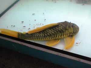 Again, I apologize for the delay in responding. -Gwen>> Peppermint Pleco hi let me first say what a very informative site. I've recently purchased a peppermint Pleco L30 which I understand will become an L31 when it matures and have tried to find some information as I do with all my fish as I like to understand there needs as best I can and have spent hours trawling the internet and all I can find is pictures which as I'm sitting looking at my Pleco as I write isn't much use to me. could you please help or tell me where I can find what I'm looking for < Planetcatfish.com will have everything you need.-Chuck> thank you for your help Darrell Egg bound Whiptail Catfish? Hello, I've been reading your site for some time now, it is absolutely amazing! I have a 45 gallon freshwater aquarium that houses 5 calico platies (2 male, 3 female), 1 female pineapple swordtail, 2 'skunk' Corydoras catfish, 3 Oto catfish, 4 Serpae tetras, 1 nickel-sized blushing angelfish and 1 magnificent 6" female whiptail catfish (I've been trying to find out exactly what kind, I'm reasonably sure she's a 'Loricariid parva'). Tank and water specs: The tank is planted with many plastic plants, with a medium sized piece of driftwood in the centre. I use an Aquaclear 200 power filter (with 2 bio sponges; never changed, only rinsed, carbon; changed every two weeks, and floss; changed weekly), a Penguin 170 Bio-Wheel filter, a UGF (bubbles, not powerhead) and a smallish Fluval internal filter with an Aquaclear sponge instead of the regular insert. The tank is cleaned with a diatom filter every two weeks (to 'polish' the water and reduce the population of parasites like Ich). I do a 20% water change every week. The pH is a very steady 7.3 (a little high, but I don't want to alter it with chemicals and none of our fish have objected so far) and has 0 ammonia and nitrites, nitrates are <20ppm. The temperature is a steady 80F. I feed a varied diet of veggie and regular flakes, bottom feeder algae and regular pellets, freeze-dried krill and occasional freeze-dried Tubifex and bloodworms. And now that you know all that, here's my question: Our whiptail seems very healthy, has a voracious appetite for almost everything I put in front of her (although I've never seen her eat in a traditional 'Pleco' way from the glass or on the driftwood, she just puts entire pellets into her mouth and 'gums' them until they're gone), but has been growing fatter and fatter over the last four weeks. At first I thought she was just settling in, growing up and filling out, but now I'm worried she may be egg bound. I have been looking high and low at all our local (and not-so-local) fish stores for a male of the same species, without success. Is there anything I should do, or can do, to encourage her to let go of her eggs? Her poor belly is very distended; she looks horribly uncomfortable, and a little bit like she's going to explode! < Unfortunately I don't think she is egg bound. Females are typically wider that males and have fewer whiskers around the head. You little whiptail probably has eaten some left over rotting food and now has a case of bloat/dropsy. In the wild they eat mostly algae. They have a very long intestinal track and the fiber in the plant matter takes a long time to digest. When they are fed lots of animal protein, then it is quickly utilized in the gut but still has a long way to go before it gets excreted. This indigestible material starts to be broken down by the bacteria in the gut. As the bacteria eat this matter then they multiply and grow and give off gas. As the fish continues to eat, then the bacteria continue to grow and blocks off the intestine. Your fish is in real trouble. Isolate the fish in a quarantine tank. Treat with 250 mg of Metronidazole per 10 gallons of water. Treat every other day and do a 30% water change too. A good sign would be to see some long stringy fecal matter. Do not feed until the swelling has been reduced. In the wild these fish do not get this much animal protein and really can't handle a constant diet of it.-Chuck> Thank you for any insight you can provide, Amy Can Plecostomus be effected by skin flukes I have a 29 (long) aquarium, I have had problems keeping any fish alive in there except 2 large, super veil angels and a (Hypostomus) Plecostomus. (Every Cory Cat fish I put in there, came down with a "pop eye" disease). So the 2 angels and the Pleco have been the only residents for 2 years. The angels were a breeding pair, until the female came down with a bad case of huge growths on her upper lip, (they looked like 2 large peas, but white or gray in color). After that she got really grumpy, I talked to an expert on angels, he said it was "kind of a wart" or a better lack of words, and that surgically removing them, and not accidentally removing her lip was the only was to get rid of them, or these growths would eventually get so big, that she will no longer be able to eat, and she'd starve. Monday the male Angel died. I couldn't see anything wrong, I have had good water conditions, certainly no over crowding. The next day I noticed white spikes coming out of my female angel, up close that is exactly what they looked like. >From the other fish experts I've talked to, it sounds as though she had body flukes. All I can think of is they must have came in on a live plant I purchased. Can Body flukes at some stage in their life be transmitted on plants? < Anything is possible but pretty unlikely> Nothing else was new in the aquarium. She had 12 or more of these "spikes". The next morning I had her "put down", so to speak. I have the Plecostomus out of that aquarium now, in quarantine. As far as I can tell I have done everything right with him. He has never shown any signs of problems. He still doesn't, he went into quarantine yesterday. I have a 2000 gallon outdoor decorative pond, I have Koi and a very large Plecostomus who will be going into very soon, ( I am waiting for the pond to do it's bacte