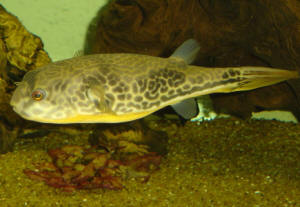"After filling its mouth with water, the fish flexes a large muscle at the base of the oral valve which then catapults forward against the entire front of the mouth, forming a tight seal against the back of the front teeth. This prevents the water from escaping while a "plunger" type of apparatus'¦ mounted at the base of the throat forces the water upward where it shoots down the fish's esophagus and into its stomach." The lack of a ribcage or pelvic bones and very flexible spine allows the puffer to inflate considerably and small muscles under the skin erect the spines. I have only seen Clooney do this once but there have been several times I saw him partially inflated in the 4 years that I have had him. Another unique feature of puffer biology is the ability to store toxins in their skin and organs. The poison is tetrodotoxin in marine puffer, but a variant, called Saxotoxin, is present in some freshwater puffers. The puffer does not produce them itself; they come from Pseudoalteromonas strains of bacteria found in the crustaceans that puffers eat. The bacterium has no ill effect on the puffer and is only dangerous to humans if puffer flesh is eaten, contact with the fish is not dangerous. The symptoms of poisoning can include nausea, vomiting, muscular weakness, paralysis, respiratory distress and eventually death. The poison can be take effect as fast as 10 minutes or as long as three hours later. No specific antidote is known. To give an idea of how powerful tetrodotoxin is, injected intravenously less than one milligram is fatal to humans, making it over 1200 times as deadly as cyanide. There is no reason for worry for puffer owners however, as the food we give our fish are free of the necessary bacteria and therefore their stores of poison will deplete over time. However, I still do not suggest you try puffer filets this summer on the BBQ; sushi chefs spend many years learning how to prepare puffers safely for human consumption. While it's generally claimed there are 50-100 deaths from tetrodotoxin poisoning a year, Japans Health, Labor and Welfare Ministry reports only 14 people dead of blowfish poisoning from 2002 to 2006, and even if amateur preparations outside of restaurants (Amateur preparation is much more likely to result in poisoning and much more likely to have the true cause go unreported) are taken into account, between ten and twenty a year is more likely. The way that puffers swim is also unique, to quote Neal Monks in his article in Practical Fish Keeping: "The way pufferfish swim compared with that of other fish is rather like comparing a helicopter to an aeroplane; while they may be slow, they are extremely maneuverable, and this allows pufferfish to spot and capture prey that other fish would simply swim straight by." Propulsion for a puffer to swim is produced mainly by the small pectoral fins on the body, with the large and impressive tail used only for bursts of speed. This method of swimming allows even the largest Mbu to turn on a sixpence or rotate on the spot; they are diligent, thorough hunters that will not dart past potential food, and find snails or crustaceans even if they are well hidden. Very little is known about these puffers' habits, it is not believed that the Mbu can be sexed from external observation and information on their breeding habits is non-existent. For this reason, all Mbu that are available in the aquarium trade are wild caught in nets and then shipped to us. It is fair to say that this would be a stressful time for any fish, but puffers seem to suffer more from it. A Mbu puffer who a couple of weeks ago was free to swim in the Congo basin or a huge lake now finds itself imprisoned in a small tank with a pink castle and some bothersome fish in its personal space. It breaks my heart to see them confined like this and if anyone has seen one in their local fish store they will know what I mean. Aquarium Care A very well respected puffer keeper of many years and scientist has recommended a tank of about 4000 litres (approx. 1000 gallons) and I have to say that I agree that a large tank is the only way to keep these fish happy. I would say that the footprint is key and that as a minimum size I suggest seven foot by four foot as an absolute minimum, with a height of about 3ft. In an ideal world I would go for a tropical pond or a ten-foot by four-and-a-half-foot by four-foot tank. This would give a probable volume of about 4000litres if you allow for gravel and decoration. You then have to deal with the issue of how to filter such a tank, so a large sump and/or several large canister filters such as Fluval FX-5s would be needed. Additionally, plenty of pond heaters would be needed to keep the temperature around 26 C. All in all an appropriate tank is a little out of most people monetary or practical range. It is also worth noting that acrylic tanks are not a good idea for large puffers, as their teeth are known for scratching the plastic, which is unsightly and may weaken it over time. Even assuming that we have a tank large enough that these puffers can turn around properly in, we need to look at decoration and design of the tank. Varied surrounds with many points of interest are necessary to keep these puffers active and interested in their surroundings; again this is something a standard six-foot tank would struggle with. Ideally you would have lots of bogwood, medium grain natural gravel and large plants. Clooney loves it when I put new plants in the tank, he will always swim over to check them out. Plants that are ideal for a tank this large include Giant Vallis and certain large sword plants, Clooney actually chooses to rest under sword plants when I have them in the tank. These fish are active hunting swimmers, not lurkers, the planting and décor should be kept far enough apart or to the fringes and background to allow plenty of room to swim about and crucially to be able to turn properly. Once you have a tank set up it will need 