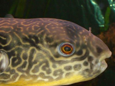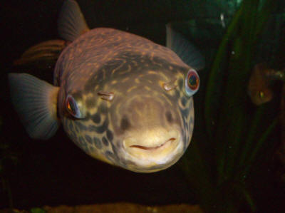 I am very fortunate to have such a great fish. Only another puffer owner can really appreciate the relationship that these fish can provide. There is something about their face that makes you feel they are studying you as you look at them. It is not uncommon to hear a puffer owner say that their puffer greets them when they walk in the room, just like a puppy. Very few fish behave in the way that a puffer does or can match their character. While some cichlids can claim to have character, a puffer has it in buckets. I shall concentrate on the Mbu puffer, as it is the species I have, but certain rules are true to all puffer species. Puffers are sensitive to poor water quality, and therefore they require over filtration and large water changes. Most puffers are aggressive and as a rule should be kept in a single specimen tank, however the Mbu is one of the more laid back species and is generally more tolerant of other fish. This needs to be taken with reservation however, as few Mbu live to maturity in captivity with other fish so it is difficult to say how that might change with age. Clooney seems indifferent to tank mates at the moment he may change his outlook as he matures. I am aware of some Mbu being very aggressive and attacking everything else that was unfortunate enough to be placed in the tank. A Few Facts about the Mbu Tetraodon Mbu is widely spread throughout the Congo basin and Lake Tanganyika; in fact the word Mbu means rock in certain African dialects. It is pronounced "uhmboo" but I say "muhboo" and to be fair I'm sure it doesn't matter. The other name often given is Gold Ringed Puffer or Reticulated Puffer and this derives from the stunning markings of these fish. The pattern of darker reticulated rings over a golden base color is unique to each individual fish and allows for great camouflage in the wild. Even a fully-grown adult can disappear before your eyes in a river and become one of the rocks, hence the local word for rock, Mbu, is used for the fish. The Mbu is the largest of all freshwater puffers and will attain a maximum size over 67cm(two feet) in the wild. They feed primarily on crustaceans such as crabs, mussels, clams, and shrimp. The reason that they can tackle this hard-shelled prey is because of the very impressive beak that they have. The name of the genus to which Mbu belong, Tetraodon, literally means four fused teeth, and the pointed beak formed by the teeth can be seen clearly on the larger puffer species. These teeth are incredibly strong and continue to grow regardless of the size and age of the puffer, so it is imperative that they feed on ever harder shelled food as soon as they have the jaw power to tackle it. Without this diet the teeth become overgrown and eventually prevent the puffer from feeding at all. In the wild the Mbu will swim along and blow water at the sand bed, hunting out prey that may be buried in the river bottom tucked away safely. Their independently moving eyes allow for a great range of vision, which helps them to take in the environment around them as well as study it for food items. I am not sure if they rely solely on eyesight to find their food in the wild, but I often see Clooney blowing jets of water into gravel to uncover something beneath. Saying whether he can pick up on a tiny movement of something in the gravel or can smell something there would be purely conjecture; but from my observations of Clooney I believe there is more to these puffers than has been researched. As the term puffer suggests, these fish are able to inflate when threatened, and though they are not easily seen as with porcupine puffers, Mbu have spines under there skin which act as a deterrent to potential predators. A puffer's defense against predators can be summed up as a warning saying, "You really don't want to eat me." Puffing is a really unique adaptation, and works thusly, according to Dr. Peter Wainwright: