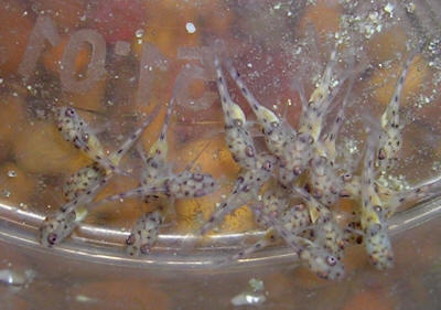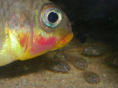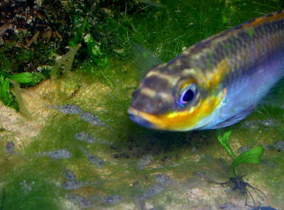 The dwarf cichlids of the genus Pelvicachromis are commonly referred to as Kribs, particularly Pelvicachromis pulcher. Older books sometimes place these cichlids in a different genus, Pelmatochromis, a genus that has long since been redefined. When it was initially imported, Pelvicachromis pulcher was mistakenly identified as Pelmatochromis kribensis, a totally different fish, but it is from this misidentification that their common name "krib" or "kribensis" is derived. The various species of Pelvicachromis differ only slightly in needs, and all have proven to be excellent aquarium fish. Indeed, for many aquarists, Kribs are ideal subjects for learning about breeding egg-laying fish and managing cichlid behaviour, being both easy to breed and easy to accommodate. Natural habitat Pelvicachromis are confined to low-lying streams and rivers along the coastal regions of western and equatorial Africa. Kribs live in shady areas around sunken wood and tree roots where the water current is diminished, but they are not commonly found in standing water. Kribs dig caves underneath logs and stones where laying their eggs on the solid surface above them. Aquarium care Kribs are adaptable and can be maintained in anything from relatively soft and acidic freshwater through to slightly brackish water. For breeding purposes though, pH becomes more critical because sex determination appears to be controlled by pH. In the case of common Kribs, the optimal pH is 7.0, at which broods will comprise equal numbers of males and females. As the pH becomes more acidic, the proportion of females increases, whereas making the pH more alkaline increases the proportion of males in the brood. The optimal pH for Pelvicachromis subocellatus and Pelvicachromis taeniatus is around 6.5, and for the giant krib Pelvicachromis sp. aff. pulcher the optimal pH is 6.0. Water temperature should be around 75F for maintenance purposes and 77-80F for breeding. These are bottom dwelling fish, and caves, large plants, and other sources of shade are much appreciated. They enjoy rooting about in sand, but they can also be kept in tanks with gravel substrates as well. They do not uproot plants. As with almost all cichlids, water quality needs to be good. Otherwise, they are not fussy and will work in any tank from 10 gallons upwards. Diet Kribs are omnivores and will eat a variety of things. Flake, bloodworms, brine shrimp, daphnia, and Tubifex are all enjoyed. Some algae seems to be important, and wild fish are not to be at least partially herbivorous, and cooked spinach or a vegetarian flake food will make a good addition to the diet. If not provided with alternative green foods, Kribs will nibble at soft plants in the aquarium, though rarely to the point of causing serious damage. Disease Nothing serious here -- these fish are remarkably durable and show little sensitivity to the bacterial and microbial things like Hexamita (hole-in-the-head disease) that plague other dwarf cichlids. Provided Kribs are given good water and proper foods, they can be expected to thrive in any home aquarium. Quarantining is always a good idea though, especially with newly imported wild-caught fish. Social behaviour Unlike many other dwarf cichlids (such as Apistogramma spp.) form stable pairs. In fact, Kribs seem to "mate for life" and stay loyal to one another even in the presence of alternative potential mates. Another distinctive feature of their behaviour is that the females are quite clearly in charge: females initiate spawning, guard the eggs, and for most of the time guard the fry as well. Males are largely relegated to keeping the territory safe and looking after the fry when the female is feeding. Characteristic of the genus are the shiny pink to purple bellies of the females. During spawning especially, the females become intensely coloured, far outshining the males in attractiveness. Although often sold as community fish, this does need to be understood in context. Compared with most other cichlids, Kribs hold small territories (about 12" by 12") and defend them only while spawning, and even then only against bottom-dwelling fish that they few as potential threats. In other words, Kribs work very well in community tanks alongside midwater fish such as danios, small barbs, and tetras. Fish that stay close to the surface, such as hatchetfish and guppies, can also be expected to do well. In fact, the addition of harmless "dither fish" at the top of the tank seems to help give Kribs a sense of security, encouraging them to settle in and spawn more readily. However, bottom-dwellers such as Corydoras will be pecked mercilessly, and Kribs have been known to seriously damage small catfish. Similarly, Kribs are a bit too large to be entirely safe with Apistogramma or Microgeophagus spp. unless the tank is so large that all the cichlids can maintain their own territories without coming into conflict. Breeding Breeding Kribs is not difficult. Any aquarist who can rear livebearer fry can rear Kribs. A 10-gallon tank is the minimum for a single breeding pair. The key addition to a breeding tank is a cave of some type, such as small flowerpot or half a coconut shell. Add some floating plants for shade. Spawning takes place inside caves, usually on the ceiling. The female guards the eggs alone. Often, it is the sudden disappearance of the female for a few days that indicates that spawning has taken place. A clutch of eggs can be as small as 20 or as many as 300. The eggs hatch after about two days, and the fry become free swimming about five days later. The female will now shepherd the fry around the tank to feed. Gradually, the male is allowed back into the family, and after the fry have been free swimming for a few days the male and female will alternate parental duties, one fish guarding the fry and the other fish going off to feed. Nonetheless, the female is clearly the dominant partner in the relationship and will look after the fry most of the time. All