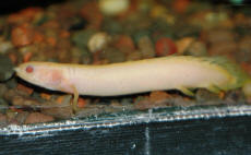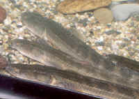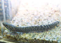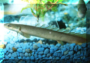 Other Polypterus species are exceeding more rare in captivity due to geographic/infrastructure limitations, or achieving too-large size. Natural Range All Polypterids are freshwater, and confined to tropical Africa. There is fossil evidence of Polypterids in South America in existence before it's separation with Africa. Size: In the wild one Bichir species approaches 90 cm. in length; yes, some three feet! Most species max. out at 30 cm., or about a foot in aquariums, with a few, including the reed or rope fish getting to a couple of feet. Selection: General to Specific Things to look for in picking out Polypterids are actually limited to two concerns; these fishes arrive in one of two "categories"; tough and ready to go, or damaged and gone. 1) Time on hand is utmost critical. All Reedfish and Bichirs are wild-collected, many via native plant poisons, and these tend to have very poor survival. Others have had a rough time of being hand or trap collected, starving in anticipation of transit, and long shipping in crowded, contaminated water conditions. The only way practical to get beyond these induced losses is to wait out a period of time; most all that are going to die will do so within a week or two of arrival. Hold on deposit, or insure that yours have been on hand at least this long before purchasing. For wholesale/importer types, please do your bit by running new arrivals through a copper/formalin bath and/or a regimen of DTHP (Dylox, Dipterex, Neguvon...) over a period of a week to knock off flukes and Protozoans before sending your stock on. 2) Red marks, bruising, sores are generally obvious on damaged, otherwise new arrivals and doomed specimens; especially around the "nostrils" and fin origins. Don't buy these fish, or any others in their system. 3) Netting and moving in general. Just a note to be aware that these fishes, oh so slow underwater, are squirmy, slimy, spiny and aerial escape artists! Either utilize your net to direct them into a large bag underwater, or if you feel you must lift yours into the air, utilize a VERY LARGE SOFT NET... and keep your hands away! The dorsal finlets on Polypterids are sharp, and on large specimens, formidable weapons... and they know it. You've been informed/warned. Environmental: Conditions Habitat Polypterids are decidedly nocturnal and otherwise secretive in their habits, appreciating subdued lighting, plenty of non-sharp decor and vegetation. Though other sources encourage the use of fine sand I don't. Bare tanks or dull aquarium gravels work just fine, and are easier to keep clean. Chemical/Physical These fishes are tolerant of a wide range of conditions, but prefer neutral to slightly acidic (7-6.5) pH, tropical (75-mid eighties F.) water of up to medium hardness. By and large all potable waters will work, and I have yet to see specimens lost due to adverse tap quality except in situations where aquarists were fooling with their water chemistry. My advice? Stick with regular, partial water changes (10-25 percent per week) to mediate aging water quality. Filtration With such occasional diggers and using live plants, I reject using undergravel filtration. Outside power (hand on or canister), and/or inside power filtration is advised without mechanical aerators ("bubblers") if you have a real aquarium (i.e. one with live plants) that is as under-crowded as it should be. Display A not so deep tank of as large a capacity as practical, let's say a good four plus times the length of your specimen/s is a good start. Not too crowded, especially with other bottom dwellers or bite-size tank-mates. The shallow, flat aspect of a "standard" versus "show" style tank accommodates these fishes need for cruising space and proximity to surface air. Again, a note re jumping, as in out; your lid must be complete and secure, maybe with a latch mechanism or weight on top. If the underside has sharp edges, or is hot from the lighting, do lower the water level to prevent cutting or burning your Polypterid. So, you didn't listen and you find your Ropefish, Bichir on the floor as so much fish-jerky. Don't give up so quick! Even if stiff-ish, rinse that aquatic Houdini off with tank water and put it back in for a few hours. Quite often a "dried-up dead" jumper will reconstitute and return to the land of the living. Behavior: Territoriality Wholesalers get away with purposely overcrowding these fishes as a practical matter, ala many African and Neo-tropical cichlids; you shouldn't do this. Bichirs are often agonistic toward their own species and will bite. Unless you have a HUGE (hundreds of gallons) system and are determined to make a try at spawning, keep them one to a tank. If undeterred by my warning, or a breeder wanna-be, purchase and introduce your Bichirs all at once, and keep your eyes open, net in hand, to separate them should things turn nasty. Reedfish are much more social, and best displayed in multiple numbers. Introduction/Acclimation It's best to put these fishes in last or close to it, to allow for "seasoning" of the water and filtration; as well as to give other livestock (fishes, plants) an opportunity to get situated and a feel for the layout of the system. A new Bichir or rope may be summarily floated and released as most freshwater livestock, with the lights off for the rest of the day. Pay attention the following morning that your new addition is well and gets something to eat. Predator/Prey Relations Polypterids get along with most everyone that gets along with them with the exception of con- and near-specifics and mouth sized tank-mates. Slow, small fishes and invertebrates will be stalked and inhaled; and they are, as you might surmise, easily out-competed for food by faster, more aggressive tank-mates. Reproduction, Sexual Differentiation: Riehl and Baensch (1996) list structural and color differences for the Reedfish as follows; the male bears 12-14 bars on his olive caudal fin, versus 9 for the females' which are light ochre during 