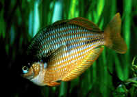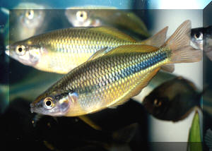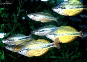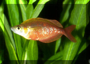 About Brackish Rainbows: Most notably the Celebes (Marosatherina (Telmatherina) ladigesi), Madagascar (Bedotia geayi), Red New Guinea (Glossolepis incisus) and many of the Rainbows of the genus Melanotaenia (e.g. the Queensland, M. maccullochi and Australian, M. fluviatilis) do much better with a modicum of salt (spg of 1.005) in their water, though they can live in straight freshwater. Selection: Sources Collection of your own specimens is a life long dream of many "Bow" aficionados. I have a few friends who have made sojourns to New Guinea and Australia in pursuit of the ultimate experience. To live where their favorite fishes come from. This is assuredly hard work, let me assure you. Most folks settle for buying captive-produced stocks out of the Far East (mainly Hong Kong and Singapore), though there are excellent sources in Germany, elsewhere in Western Europe and many breeders in the United States. You can find these commercial interests on the Internet, through national hobby magazines, and they and other hobbyist suppliers through a few clubs, bulletins and "user-groups" on the Web (see biblio. below). There are a few to several species that are so popular that larger, better-stocked retail livestock fish stores carry them as well.