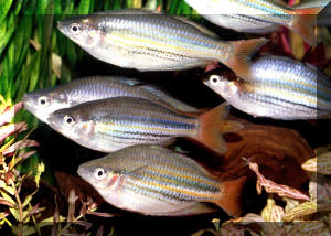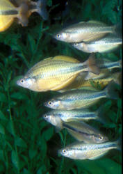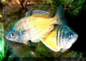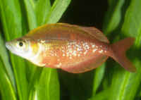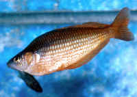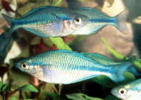 Chemical/Physical As a group, the true and not-so Rainbowfishes are very adaptable, coping in a wide range of water qualities. For most species temperature, hardness and pH of 24-26 C. (75-79 F.), dH of 6-10 and neutral pH (near 7) are ideal, but values about these numbers are fine (though species of Iriatherina and Rhadioncentrus prefer pH's in the 5.5-6.8 area... and some Pseudomugils do better at elevated temperatures.), and more important is stability all the way around. The vast majority of tap-waters are fine used as is (dechlorinated/dechloraminated of course) for regular (weekly) partial (10-20%) water changes. The immediate increased activity and color of specimens concurrent with this maintenance are appreciable. A note to those who feel or have an actual need to modify their Rainbowfishes water chemistry. If you're adding salt, changing pH or hardness overtly, do so in advance of using such water in a separate storage container. This stored, pre-made new water is best kept in a designated container, near the main/display system with its own pump (to circulate, transfer the water) and heater. These are far from "touchy" fish species, but this simple arrangement and practice does a myriad of "goods". Gary.L input: "Water changes. Rainbowfish REALLY like water changes. I typically perform 50% water changes on my fish (weekly suggested but at least 1x every 2 weeks) and they really enjoy this. 10-20% weekly changes really just doesn't get the job done. Hardness, pH On the GH side anywhere between 100 ppm - 250 is fine for them. Harder is ok too but they get tougher to breed and the eggs sometimes don't hatch at the higher hardness values. On the KH end I feel that it is extremely important to get at least 3-4 degrees of carbonate hardness here. If you have softer water supplement it by adding baking soda, sodium bicarbonate. In my water a tablespoon in ~ 55 gallons increases by about 1 degree KH. pH bounce is something that really stresses rainbowfish and if present can cause them to get TB. Most of the rainbowfish people have pretty well discounted the other wasting diseases. TB is not easy to test for but when it has been done - skin ulcers, mouth ulcers, bloating (shot kidneys) and wasting have all been positive for TB." Behavior: Territioriality/Aggression To a one, these fishes can be considered "community" species (though some quite large at adult size), getting along with others of their kind and other fish life. If their accompanying tankmates can stand the Rainbows rapid, continuous swimming behavior there is a good chance they'll all get along fine. Male-male displays, particularly in situations where there are disproportionate numbers of males to few females, may become heated at times, but rarely result in real injury. The general rules of careful observation of your livestock, under-crowding, providing plenty of cover for sub-dominant individuals applies here to prevent damage, losses. These are schooling species. They live in groups that may total only a handful of individuals to dozens. They will only do and show their best maintained in numbers in large enough systems to allow their shoaling behavior. Good-sized volume of system and presence of their kind will virtually eliminate any ill-effects of aggression amongst them. About equal sex-ratios work well in most settings. Acclimation Given healthy specimens, and pre-set water conditions, a cycled system with live plants, acclimating these fishes is a breeze. Some ready mixing of water from the main system, either through a drip approach or periodic ladling, will do to ready them for placement. Reproduction: Breeding these fishes is a fun/trying, easy/hard enterprise. Fun and easy because so many species do readily spawn in a wide range of conditions; trying and hard for the one-at-a-time egg-laying/fertilization process and seemingly slow progress of growth of their young. The sexes are easily told apart as they mature by the males larger size, more flowing unpaired fins and better coloration. You will know by their intense coloration, rapid swimming, forays into plant thickets, fin extension that your Rainbows are breeding. The small (1-2 mm) eggs are hard to make out (use a bright, focused flashlight), hatch out in 5-12 days (depending on species, temperature), and may be consumed by their parents (commercial breeders remove the spawning medium or parents). Small live foods like rotifers and brine shrimp nauplii, microworms are of use as first foods and lesser so, dried prepared foods of small size. Commercial, large-scale production methods vary... some folks separating males, females for conditioning... others leaving out spawning media in the breeders bare tanks when they don't want them breeding. There are folks who utilize ponds, large tanks and move spawning materials with eggs on a semi-continuous basis to optimize yields. Some friends of mine in the industry use nothing in their water to prevent fungusing of eggs, other writers swear by the addition of methylene blue, acriflavine for this purpose. If you are interested into delving into these controversies, peruse the literature cited below (there is much more). About Crosses: Please don't do or Sponsor this!