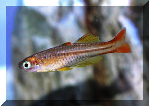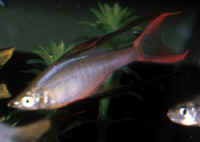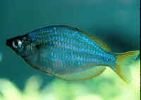Foods/Feeding/Nutrition: All of these fishes readily accept all forms of foods, live, dry, freeze-dried, frozen/defrosted that are small enough to be taken in their small mouths. Do study their natural food choice/habits (e.g on fishbase.org) and try to provide them with some live foods everyday. Mosquito, Glassworm (Chironomid) larvae, brine shrimp, Daphnia, wingless fruit flies, small worms, even ants are consumed greedily by most species. Take care to provide foods in small quantities over an extended period of time (minutes) for these fishes, as most are "surface" feeders. Some authors cite once daily feedings as being adequate. I prefer two, three small feedings for color, growth and encouraging foraging behavior. Hunter (1997) emphasizes the use of greenery in these fishes diets. He states that supplying zucchini (without the rind) as an adjunct to ensuring good spawning success. Disease Prevention/Cure Though not widely regarded as a disease per se, senescence and death by "old age" is a factor of interest in husbandry of all life. Small species in these families can be expected to live 2-3 years, larger ones perhaps 4-8 years in captivity. You may well want to acquire your specimens at sub-adult sizes/ages to assure having and breeding them a good long while. These fishes can contract and succumb to parasitic diseases, though they are amongst the last fish groups to do so in terms of order or susceptibility. Happily, correcting the root causes of such infestations, treatment with standard approaches is efficacious. There is an "environmental" infectious (bacterial) condition/disease that at times has reached pandemic proportions. This "Rainbowfish Disease" shows as a rapid onset degeneration of body scales, flesh. Hammer (1996) writes of his successful trials with the antibiotic Ceftin (Cefuroxime axetil). Quarantine (two weeks), care in selecting healthy specimens, providing optimized and stable appropriate habitats and feeding will likely spare you from exposure to this complaint. Cloze So it goes for this brief expose of these closely-related families. Bored with a general community aquarium mix? Not up to the hectic scramblings of African Cichlids? No desire for a big, ugly eat-em-up specimen tank? Not ready, desirous of delving into marines, but want fishes just as beautiful? Do consider the Rainbowfishes, real and not. They're hardy as freshwater fishes come, interesting to a fault, fun, even possibly profitable to breed and raise, and gorgeous and interesting in body shape, finnage and color. Thanks to: Friends Kent Webster and Jorge Sanchez (Sahul Aquatics) of California for help in identifying my photographs of these fishes, general input and camaraderie.