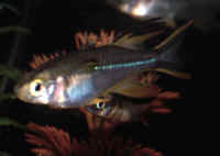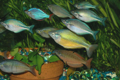 The order of "Silverside" fishes Atheriniformes contains a mix of fishes spanning two suborders and three-four families that are commonly called Rainbowfishes (though some folks would leave out, gladly, the Betodiidae of Madagascar... the Blue Eyes...) Though a handful of these species have been employed as ornamentals for the last few decades, only until the nineties did many new forms make their "splash"... becoming the "Gouramis" of their time (and now!) in terms of popularity. This status is well-deserved. These fishes are lively, beautiful (well, most of them, as adults, in good health...), hardy, and actually enjoy the all-too-typical hard and alkaline water that many folks are faced with as mains/tap supply. Classification: Hmm, let's see, most atheriniforms have two separate dorsal fins. Their lateral lines are either absent completely or very weak in appearance. Some other arcane internal features could be mentioned (see Nelson). Let's mention the peculiarity of their larval gut lengths... they're short. Some indication of their need for continuous feeding, and slow rates of growth as/when young. Eight families comprising forty seven genera, 285 or so species. Some of all three suborders of the Order Atheriniformes, four families and more than a hundred species bear the common moniker "Rainbowfish"... though to science, the Family Melanotaeniidae are THE Rainbows. The Pet-fish named Rainbowfishes: Commonly encountered species Order Atheriniformes Suborder Bedotioidei: Family Bedotiidae: The Madagascar "Rainbowfishes". All freshwater. two genera, about nine species.