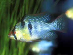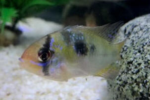 1/23/12 Ram Cichlid Pairing 9/13/10 My blue rams are growing up 8/2/06 Good evening, everyone! I will try to keep my question short while still providing relevant information and background. No hurry on this reply, as I am not having an emergency. I have a 12 gallon Eclipse tank, which has been up and running for about three years. I have had Gouramis, neon tetras in it... redoing the tank about once a year, making sure not to over clean and starve the plentiful green algae. Since February, I have had a pair of Blue rams (not the German kind) which spawned immediately after first being introduced, but ate all of their eggs by early morning! <Very common... Microgeophagus rarely rear young successfully w/o aquarist intervention> (That's ok.) They share their tank with 3 Rummynose tetras as dithers and a Bristlenose catfish and Otocinclus as a clean-up crew. I have removed the hood of the Eclipse (the Eclipse is my smallest and my only "closed" system) and replaced the compact lighting fixture with two 18" hoods, off of my two old 10 gallon tanks. They are powering a fluorescent color enhancement bulb and a high spectrum plant light. The fish seem to like the lights better, their colors look brighter - but since the hoods are not a perfect fit, I seem to be getting a blob of brown and green algae growth in the overhanging corner, attaching itself to a fake plant. Is this harming the fish in any way? Degrading the water quality? <Maybe... I would "give it a swipe" with an "algae" sponge when doing water changes (each week)> My second question is, is this too small of a tank for two Rams to thrive in? <Mmm, no, should be fine> At my LFS they were in a 125 with a bunch of different fish, Angels, African butterflyfish, serpae and phantom tetras, etc. <Yikes... hard to catch out of> ... so I felt kind of bad reducing their living space to just 12 gallons, but their color is much better now than it was at the store, and they are hearty eaters, active with friendly dispositions. One more question: I have a 29 gallon community tank with tetras, rasboras, various bottom dwellers. Would they be happier in this larger tank? <Might be... if it's not "too busy"> I thought they were better suited to a species tank but as I cannot really afford/don't have the space to make the Rams a bigger tank all to themselves, I am basically between these two options, either keeping them where they are or moving them to the community tank. <Worth trying the move...> They are regularly fed frozen food (Mysis shrimp, Tubifex, blood/white worms etc.) and Spectrum pellets, a variety of Tetra foods and Spirulina flakes. Water parameters are much the same each week, with nitrates and ammonia always about 0 ppm. I add blackwater extract every other week and perform 20% water changes weekly, along with daily top-offs. Is there something I could be doing to give my Rams a better life? Should they move into the bigger, bustling tank or would they be happier in their own quiet corner? <Likely the former, where they are presently> Am I stunting their growth and diminishing their life span by keeping them in the 12 gallon? <Mmm, nope. Unlikely> A conscientious aquarist wants to know! She appreciates all of your help greatly and would appreciate a reply at your earliest convenience. Thanks a million! Nicole <Welcome in concomitant number! Bob Fenner> Rams and Plants. Dwarf cichlid... sys. 3/18/06 Hi, Nice site! I have a 2 and a half gallon tank (bow front). It is well planted with a heater and small whisper filter (a newer air driven model) and 1.5" of gravel. So my question is: Can I keep 2 German Blue Rams in the 2.5? It is has been cycling for 2 months now. What maintenance would I have to carry out? Thanks, Anthony <This is really too small, unstable a "world" for Apistogrammas, Microgeophagus... but could be tried... with care in pre-making, storing all new water, extreme regularity in maintenance. Please read here: http://wetwebmedia.com/FWSubWebIndex/rams.htm and the FAQs file linked above. Bob Fenner> Ram Now Has Popeye 2/18/06 Thanks for your quick response last week. I QT'd the fish and followed your advice with the Furanace. Unfortunately on day 3 of the treatment I noticed that the expiration date on the medication was 2 YEARS ago... the ram hadn't really eaten in 4 days and I didn't think he would survive another 4 days with new meds so I put him back in the main tank where he was eating and happy to be with his mate. His nares got better, I kept up with water changes and thought all was well. (My ammonia, nitrites are 0, less than 10 nitrates, water is RO with RO Right mixed to keep a lower pH and softness...) Yesterday he developed Popeye. I QT'd him again, added Stresscoat and Epsom salts to his tank. (His QT tank water is all at 0 as above). I see no symptoms of anything wrong, just one eye bulging out. The other eye may be swollen a bit, but not much I can tell. Is there anything I can do to help this poor fish? I just can't figure out what is wrong with him... is there an all purpose antibiotic I should try on him? Thanks again, Cathy G Oh, the expired meds all came out of a fresh shipment of meds to the store - somebody needs to get a better supplier me thinks... < The Popeye is an internal bacterial infection behind the eye socket. Treat with Metronidazole as per the directions on the package.-Chuck> Ram Cichlid With Bloody Nose 2/10/06 I have a Halloween Ram - commonly known as a blue ram. He has been living just fine with his pretty wife, (I performed the ceremony myself), they eat and spawn regularly. Nothing has changed in this planted tank except that a week before this happened I rearranged a couple of plants and driftwood. I do frequent water changes, everything is 0 except nitrates - these are less than 10. The water is soft, pH is 6.8, temp is 82. My ram has developed glow-in-the-dark red nostrils. 2 days ago he went into hiding and stopped eating. Now however, he is out and about, eating and explorin