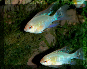Habitat: Tank Size: Some writers have kept and bred this species in systems as small as five gallons. I suggest at least twice this gallonage, or better, much larger if you're not interested in maximizing reproduction, to observe more than just one pair interacting with others of their kind and other species. Some lighting is recommended for your viewing pleasure and live plants if employed, but nothing too consistently bright. Water Quality: A major failing point in this fish's care and keeping is too hard, alkaline or cold water. Even if you're not trying to breed and rear young, Rams need soft (to medium hard) water of low pH (5-6 is ideal) and water in at least the low eighties F., preferably the mid to upper eighties F., particularly if you're trying to breed them. Metabolites are also an issue with keeping, breeding this fish. As little to no detectable nitrate is ideal, and of course no ammonia or nitrite. These conditions are possible to achieve with demineralized water (by itself or mixed with tap), peat use (in the filter flow path) and frequent partial water changes... as well as by having large systems with live plants, sparse feeding and stocking. Tankmates: By and large Rams are good community fishes, rarely bothering any but the smallest of tankmates. However, they themselves can be easily overwhelmed by other animals that are too active or over-eager feeders. Plants should be selected (if used and this is encouraged) which likewise enjoy or tolerate warm, soft, acidic waters (e.g. Nymphaea, Mayaca, Echinodorus, Cabomba furcata). Do consider setting up a biotopic presentation with Rams as the focus. There are few "stock" aquariums as gorgeous as a richly planted "llanos" (freshwater savannah pools) with submerged wood, small groups of characins, Corydoras cats and Rams. Heckel Discus and wild Altum Angels can even be mixed with Rams. At any length, using small tetras such as pencilfishes, smaller barbs like the gold, checkerboard or cherry or smaller Danios as "ditherfish" is strongly encouraged to "draw out" the shy Rams. Foods/Feeding Nutrition Until you've seen a well-conditioned Ram in its full glory you won't know why this fish is also known as the Butterfly Cichlid. Ones that have been fed a mix of meaty foods, chopped, frozen/defrosted or live can be exquisitely beautiful, with iridescent blue, green, red, orange and yellow highlights. Reproduction Pairs are best "made" here as with other larger neotropical cichlids by buying several small individuals and allowing them to match up with time. Males of equal upbringing care have more pointed and long dorsal fin spines, particularly the third. Right before spawning, females have distinctively red abdominal regions. Many shipments from captive-produced stocks from Singapore and Czechoslovakia have most or all male individuals to suit the market. Wild specimens are available from Colombia from time to time, and these are suggested for broodstock. Spawners should be supplied with a few flat rocks and real or plastic broad-leafed plant cover. Many writers suggest raising temperature from 82-86 to the upper eighties F. to instigate spawning.