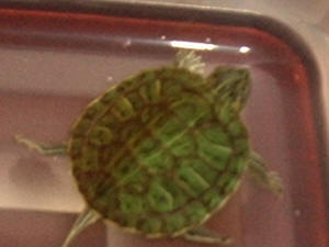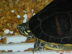comments! 3/26/11 Green Turtle Turning Yellow? 12/13/04 <Hi, Pufferpunk here> My Red Eared Slider's shell is starting to turn yellow and has very little green left. He is fed properly and has the correct tank set up. He doesn't act sick and he still eats well. We have had to deal with soft shell before and it looks similar but I'm much more educated now on lighting and diet so I don't think that's what's causing his shell to turn yellow. Is there another disorder that could cause this? I have been to every web-site I can find but can't find anything describing this. Please let me know. <I would be interested to see a detailed description of habitat set-up, lighting types (right down to wattages, brands, bulb ages, height of fixtures above basking area), diet, temperatures....and photos of the 'ailing' terrapin in question. The herp expert I am collaborating with on this question usually works with all the data he can collect, then go with a process of elimination. There are a couple of possibilities that could be linked to diet and/or lighting on this one. ~PP> Amy Female Turtle Bit Off Male's Claws? 1/9/04 Hello, <Hi, Pufferpunk here> We recently came back from vacation and while cleaning the 150 gallon tank that holds our two red eared sliders (6 inch male and 10 inch heavy female) <What a nice sized tank for 2 turtles! So many folks don't give them enough room to live.> We realized that the male's long beautiful claws had been replaced with some awful wounds. There may be one or two claws left but they look like stumps now. <What leads you to believe the female caused this? I've never heard of turtles attacking each other's claws like that. Maybe his foot got caught in between some rocks?> They seem to be healing fine (not much red left on them). Is there anything I should do to shorten the healing process (like antibiotics, extra vitamins, or separating them)? <You could try adding Melafix (sold in the fish dept.) to the water.> He harasses her constantly and always seems to be fluttering her face. I have not seen him do this since we've gotten home but he is still continuously trying to get it on. I even saw "it" out today. It is the middle of winter and I am wondering why he is still trying to mate. <Sorry to say, that is the male of most species' behaviour!> The temps in the water are about 69-71 degrees. Should I change the water temps. I have yet to turn the heater on because I thought they still have yet to calm down for the winter but can do so if recommended. (They have had eggs in past and once we incubated them and about 40% hatched but are not hoping to do this again at least until the house is warmer -spring/summer if not until next year 2006). <My opinion is that if you are not planning on seriously hibernating them for at a least a 6 week period, I'd keep them warmer.> They eat well - lots of goldfish, pellet food, and snacks like worms, crickets, etc. with extra reptile powder vitamin on some of their food. They seem to get along fine except when he's incredibly horny. What can we do to give him the equivalent of a cold shower when he's getting out of hand? OR is it possible the wounds are something else? <Sorry, I don't know any way to "cool" him off. There is a possibility that his nails just got too long & shed naturally, or got caught on something. I try to trim mine when they get overgrown.> His eyes look clear and he seems to be fine with exception to his swimming skills decline do to the actual wounds. Can you recommend a good book that would cover these topics - I may need to learn more even though we've had her for 9 years and him for 7. <It sounds like you are taking great care of your turtles--even breeding them! I like this site to search for info: http://www.turtletimes.com/> On a side note, we've always wanted to get a pastel and are wondering if another male or female would be safest to introduce? We will be sure to wait until it is large enough to go in their tank and disease free but what would get along best (a female we guess would be better)? <Actually, getting another female would probably take the "heat" off the other one.> How often are you supposed to feed them - we are sometimes erratic with a feeding schedule and while we are writing in were curious if this is bad for them. <Binge & purge feeding is most natural. Feed well every 3-4 days. You could save some $$$ by buying the cheapest fish you can find at the produce market. I cut up into bite sized strips & freeze, then thaw in warm vitamin water, as needed.> Thanks, Sara Yule Producer Wiggle Puppy Productions <What are Wiggle Puppy Productions? I really love my new JRT, Kalvin the Krazydog! ~PP> My Red Eared Sliders Hi, I bought two RES for my son for Christmas one of them is doing fine and seems to be growing normally. The other my favorite is not growing he is still the same size as he was when I got him and today I noticed that he seems to be off balance he keeps flipping backwards and swimming in circles I have looked him over for injuries and have found none, his eyes look fine the only thing I have done different is I got them some krill said it was high protein. If you could give some advice I would appreciate it. I know of no reptile vets in my area. Thanks Sandra < You don't want to give them a diet too high in protein or else they grow faster than their shell. This leads to a distorted shell that never really looks the same. I would isolate the smaller turtle into his own tank. Makes sure. If he still has a good appetite then I would give him some live food such as mealworms, earthworms and crickets. Make sure to give him a warm dry area to bask. A heat lamp with a full spectrum bulb is recommended. Usually high heat will take care of most of the parasites that affect turtles. Make sure to keep up on the maintenance and keep their tank clean.-Chuck> Turtle Q's Hello <How goes it?> I have a slider which I have had for about two months now and everything was going good, but lately he