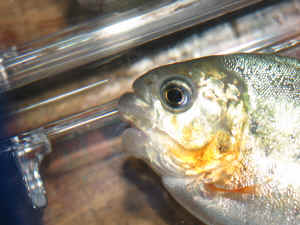 What's in a name.... I am interested in Parrot Pacus, the trouble is that there is not a lot of info on the web, could you give me some? For example, what is the minimum tank size for two or three of them, how easy are they to care for, and where can I find them? --Aaron <Hi, Aaron! First off, by 'parrot' Pacu, do you mean Ossubtus xinguense? Fishbase.org says they max out at about seven inches, so *if* you can find them, you could probably keep a few comfortably in a 40 or 55 gallon aquarium, though as always, larger is better. As for ease of care - well, like you, I'm having a great deal of difficulty finding information on this fish. I'll refer you to WWM's piranha/Pacu/silver dollar information: http://www.wetwebmedia.com/FWSubWebIndex/serrasalminae1.htm . And now, for finding them. This is going to be the tough part. Do a Google search on the scientific name, and also get in touch with some of the companies that deal with south American fishes (I can only think of www.belowwater.com off the top of my head, but I know there are plenty of others). I believe you'll have some real difficulty trying to find this Rio Xingu native. I think if you do find them, they'll come with a hefty price tag. But looking at the FishBase pic, that is indeed a cute fish. -Sabrina> MEANWHILE MEET THE PIRANHA THAT MURDERS FRUIT 11:00 - 01 September 2003 Piranhas have a reputation as deadly and ruthless predators, capable of stripping a carcass to the bone within minutes. But yesterday scientists revealed how a newly-discovered relative of the sinister species has developed a distinctly sweet tooth, enjoying chomping on fruit. The fish is one of a range of bizarre and colourful marine creatures revealed to the world for the first time this weekend. A team working in the rainforests of Venezuela have identified 10 previously unknown species of fish, along with a new breed of shrimp. One of the new additions, an armoured catfish complete with a crown of protective spikes, was immediately dubbed "punk". The team, US-based Conservation International, has also identified a new relative of the Bloodfin Tetra family, a vivid red and green fish named Aphyocharax yekwanae in honour of the native Indians who live in the area where they were found. The discoveries were made in the Caura River Basin, around 300 miles south east of Caracas, an area of untouched tropical jungle crisscrossed by waterways. Conservation International is now calling on the Venezuelan Government to make the 11,115-acre area a wildlife reserve. Zoologist Antonio Machado said: "For its size, it's incredible what the area has. It's a hot spot that should be protected." Conservationists fear the tranquility of the river basin will be shattered by human settlement, increased farming and fishing. They also claim it is at risk from a planned hydroelectricity project. <Again, thanks to you Mike. Bob F> Pacu Snout Sore Hi guys, <Hi, Andrew, Sabrina with you today> How's it going? <Not bad at all, thanks!> I have a six foot tank housing 2 juvenile Pacus and one small black shark. The larger of the 2 Pacus has some injury around it's snout area, it looks similar to hole in the head but I don't know exactly what is wrong with the fish. He is feeding well and actively swimming around the tank, plus he is exhibiting remarkable growth. I am concerned about his snout though. I bought him at the shop having inspected the injury, which seemed minor at the time. <Minor or not, it's always best to try to get only healthy, uninjured fish, as I'm sure you now know> Do you know what is affecting his snout ? <Well, with the pics you sent, it does indeed look like hole-in-the-head/HLLE. This illness typically affects large predators (usually cichlids) and can be brought about or exacerbated by constant poor environmental conditions or sometimes improper feeding. It can be a protozoan infection (Hexamita) and may also be worsened by systemic bacterial infection on top of that.> How should I go about treating him ? <Well, first off, absolutely keep his conditions pristine, for starters. Good water quality is a must. Moreover, I'd recommend to put him in a hospital tank for treatment with Metronidazole, which does seem to have some effect on this illness. His face does look pretty bad; he may never heal completely, even if you can kick the problem. Hopefully, though, you can at least get it to stop progressing, which will surely kill him eventually. I suspect maintaining a healthy environment and letting time go by will be your best advice, yet I would appreciate your opinion as the snout looks quite serious - the flesh is exposed to the extent that the top dentition is clearly visible. I enclose some pictures to assist your speculation. <Definitely good advice to keep his environment healthy ;) but in his case, I do recommend treating in a hospital tank. It does look quite serious at this point.> Thanks for your time in advance, Andrew Hough <Any time!> Piranha's I have noticed that your piranha spec sheet is off a little. You can look at other websites to get a better understanding. It says that p. piraya is a max of 13 inches. That is a common Redbelly that can reach that size. P piraya can reach 20 plus inches. I am not trying to boast or anything like that. I just thought that I could help a little with your info. Also the piranha that is listed as p piraya is a red belly. If you want I can give you a correct pic to use on your site. It is one of mine, and no copyright infringement to worry about. I have learned a lot from this site and would like to give a little back. Thanks Alex <Thank you for the input and kind offer. Do send the Natterer's pic and I'll post it with credit to you. Bob Fenner on FishBase: http://www.fishbase.org/Summary/SpeciesSummary.cfm?ID=8696&genusname=Pygocentrus&speciesname=piraya> Silver dollar problems Hi there, I have a question. I have a 150 gallon tank with 5 silver dollars in it (among others). One of the silver dollars is very large