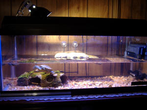 Turtle Trouble in Japan Dear Wet Web Media Crew, I'm living on a military base in Japan. Our vet doesn't service turtles and I'm at a loss. I've had my turtle since it was a hatchling (the size of a quarter). It's about 2 inches and is currently in a 10 gallon tank. I change its water once a week. Feed it pellets 2 times a day and offer it tuna, carrots, apples, etc. (though it currently ignores all veg./fruit - which I've read is normal for young turtles). I have a basking area in the tank, lighting, 3-stage filtration. I use a water conditioner and dechlorinator. I've read that turtles shed, but I'm not sure if my turtle is shedding or has fungus.... whatever it is, it doesn't appear to be going away on its own. One web site recommended adding 1/4 c. salt for each gallon of water, but I read in one of your sites Q&A's that sliders can't process salt. If I suspect fungus, what can I do? Are fungi treatments for fresh water fish ok for my turtle? Also, one site recommends live feeder fish, while I noticed a link on your site warned against it, just wondering what's best and why. Please help. Stacia <Aquatic turtles often suffer from whitish patches of fungus on the skin. Zoomed makes a medicated sulfa block called Dr. Turtle that will treat 15 gallons of water for both fungal and bacterial problems. The salt is an old remedy that affects the disease but not the turtle so they really don't have to absorb or process it. I would stick with prepared foods and stay away from the feeders for now and go with a more invertebrate diet for smaller turtles. Larger one may take more vegetables. Feeders are messy and have bone that may injure a young turtle.-Chuck> |