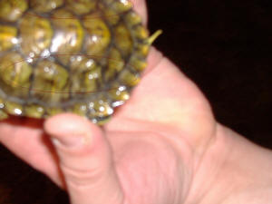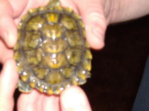 Turtle with Spot Problem 7/17/05 Hi! I hope someone can help with our problem. Our turtle recently visited grandma's house. He had the same diet , lights etc. the only thing different was the water. He is over one year old and has been very healthy with a beautiful shell. When we got home from our vacation we noticed a couple of gold spots or patches that seem to glow or reflect light when he's in the water. They are not really noticeable when he is basking on his rock. They also seem to be spreading. The spots are not soft nor have any different texture or anything unusual other than the gold color and sheen. We have spent hours looking on line for a diagnosis, but cannot find anything that describes this unusual problem. We will take him to a vet, but I have a feeling that the vet may not know what it is either and will just tell us to treat it like shell rot or something. Please help us with our beloved pet. Thank you! Mom and Daughter < Take your turtle out of the water and gently scrub his shell to see if the gold patches go away. It may be some goldfish scales stuck to the algae on the shell. After scrubbing the shell the spots may still remain. Look at them closely with a magnifying glass to see if there are any true holes in the shell. If there is then you turtle may have some shell rot. Get some Reti Turtle Sulfa Dip and a Dr Turtle Sulfa Block and follow the directions on the package.-Chuck>Turtle with Spots II 7/18/05 > Chuck- Thanks for the quick reply. We have scrubbed the spots. Nothing > happens. He is kept in an aquarium alone, not in a pond. There are no > holes in his shell. The spots appear brownish when he's out of the water. > Could this have something to do with the minerals in grandma's water? Her > water is very "hard" with a lot of mineral content. He did bang around a > lot and fall off his rock at grandma's house. He was in a ten gallon tank > instead of his usual twenty gallon long tank. Can a shell get bruised > from falling, tumbling and hitting the side of the tank? Thanks! M & D < Turtle shells are pretty tough. I doubt these spots are from any physical trauma. Shell rot has been associated with hard water but it is not certain why. If the spots are symmetric al then I would think it is a color pattern and not a disease. If the spots get bigger then take a very close look at one of them and see if there is a bacterial infection growing under the scutes. This would require cutting a small hole into the shell to get to the brown material under the shell. I would not attempt this unless I was very sure that there was a problem.-Chuck>