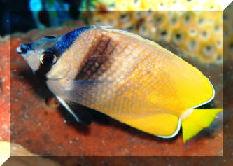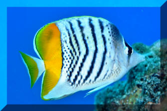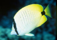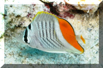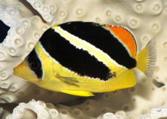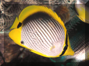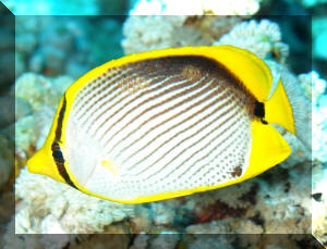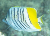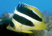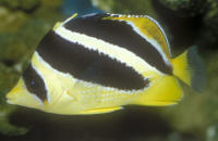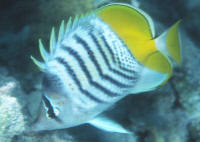 Chevron Butterflyfish. To five inches. Feeds on invertebrates and algae.