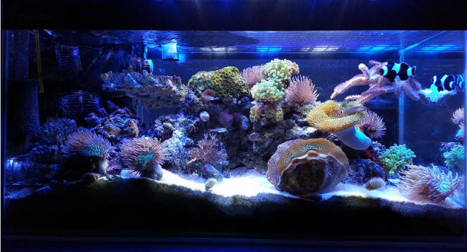 corals, with LR and aragonite sand, Tunze 9002 skimmer, Fluval Edge HOB