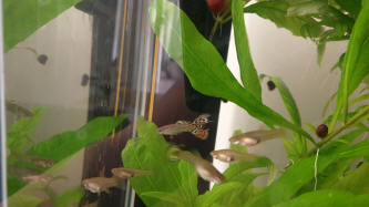 There is 1 adult male guppy in with about 25 females and maybe a 2 young