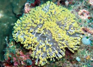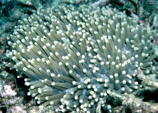 Concerning tankmates, large crabs, hermits, lobsters can be trouble; as are eels, triggers, large puffers and big wrasses; by being clumsy as well as errant sampling. Butterflyfishes may nip your Plate Corals and Clownfish have been known to adopt Heliofungia as an ersatz symbiont. Selection: Examine prospective purchases carefully for discontinuous tissue coverage; either discolored flesh, or with their septal skeleton showing through where the tissue is torn. Healthy Heliofungia are open, displaying tentacles continuously and should be colored consistently when in good health. Damaged specimens rarely recover. Take care in moving the Plate Corals. They tear easily. Wafting your hand gently near an expanded one before moving will cause it to retreat into its chitinous/calcareous skeleton. Touch it gently on the bottom/underside and slip it into a water filled bag underwater. As a general rule all Fungiids with the exception of Heliofungia actiniformis (which IMO should be removed from this family... taxonomically) are pretty sturdy aquarium species... given initial good health, suitable, established homes... Heliofungia/Long tentacle plate corals rarely fare well for any length of time... due to not being placed on soft/fine sand substrates, and too "clean" settings mostly. Am hopeful my purpose is obvious here; to give hobbyists fair warning as to this species needs; not to discourage its keeping outright. Habitat: Most Fungiids are found in shallow water (under ten meters in depth) on various types of substrates; rocky, sandy, to silty. Ones with a high relief (dome-shaped), and spines/septa of low relief utilize these aspects of their morphology, expansion of their polyp-bodies, and/or muco-ciliary action. The more flat-profile, un-toothed septa species that are more often offered to the hobby don't have as much latitude at throwing off sediment and should be placed accordingly on softer, low-detritus bottoms out of the way of direct current. Heliofungia are found in "less than ideal"