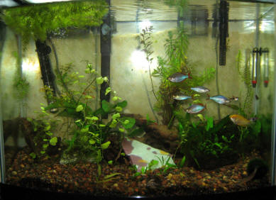 very low stocking densities of small fishes such as Neons or Guppies.