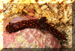 N. kubaryana; black body with green circled orange spots. To 10 cm.