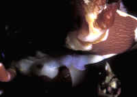 blue-black, the latter with yellow internally, oral region blue. Feeds on
