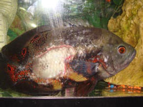 a Nicaraguan, and two Plecos. The albino Oscar has lost some scales on a