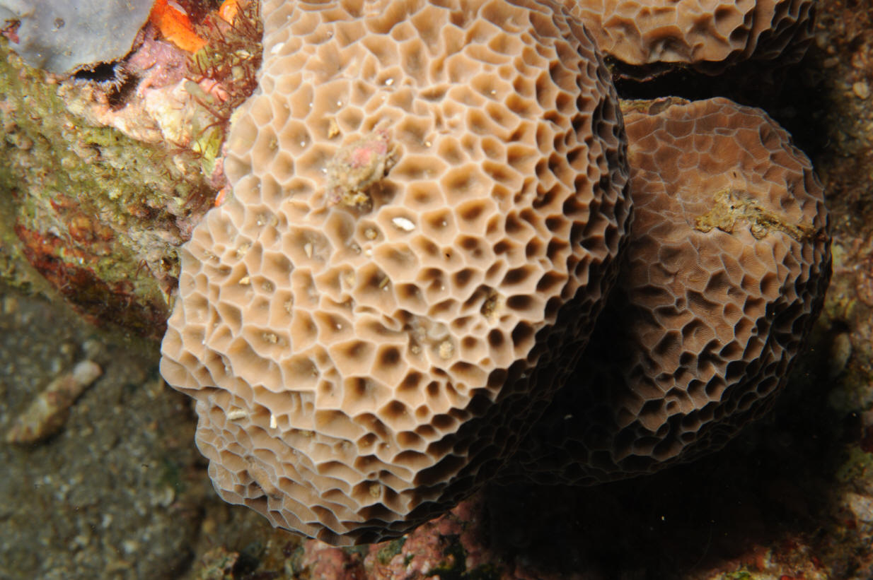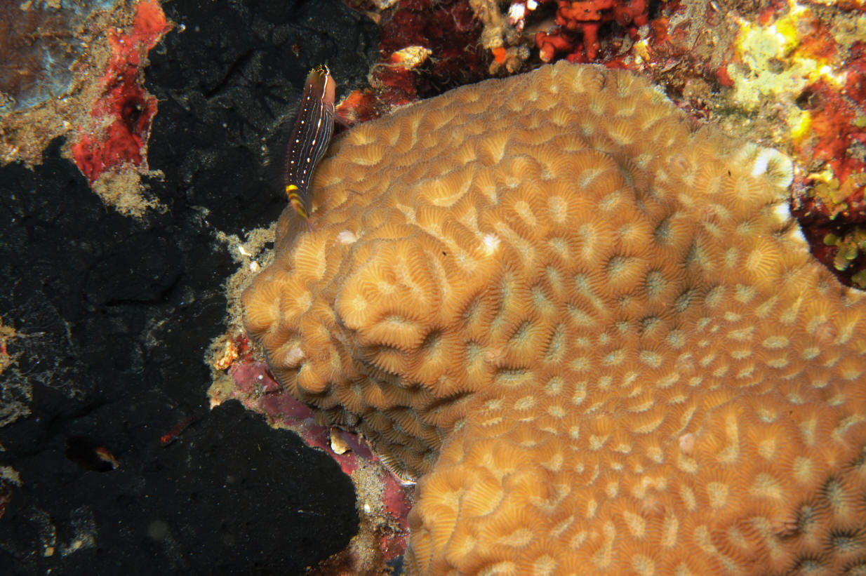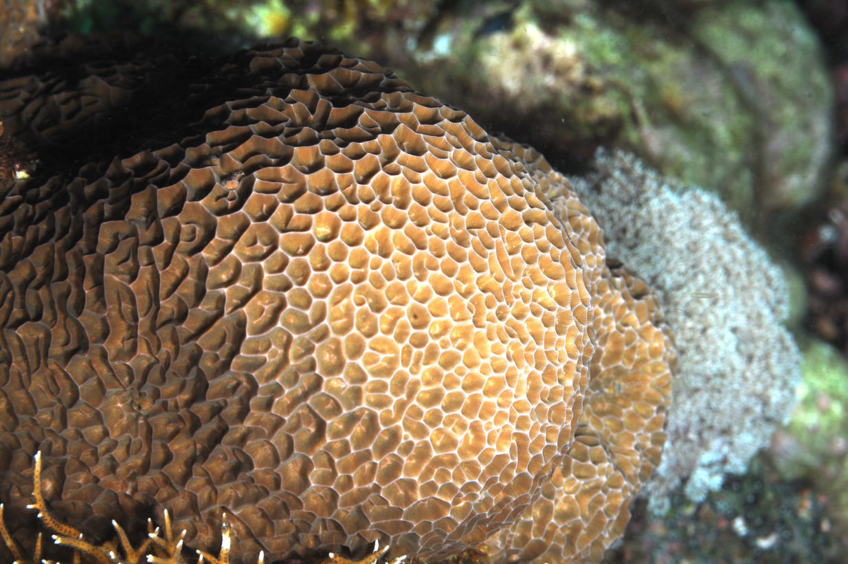 Gardinoseris planulata (Dana 1846). Massive to encrusting. Corallites separated by high walls, columellae present, septa-costae fine, even. S. Leyte 2013