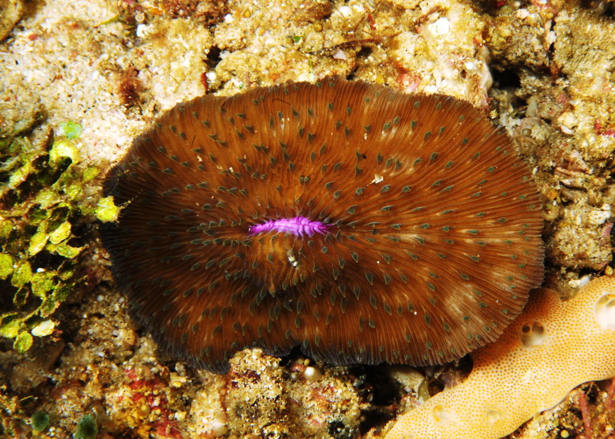 Fungia scutaria Lamarck 1801. Oval, heavy polyps with high, regularly placed tentacular lobes. To seven inches. Indo-Pacific. Occur in many colors. S. Leyte 2013