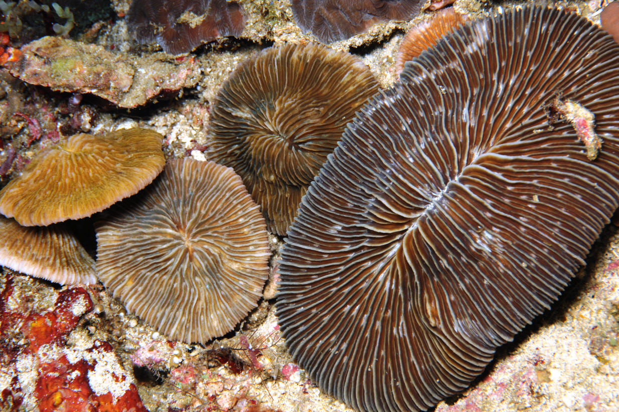 Fungia spp. Here in a typical mix from "falling down" a slope in a jumble. Still alive, and can/will "walk off" in time. S. Leyte 2013