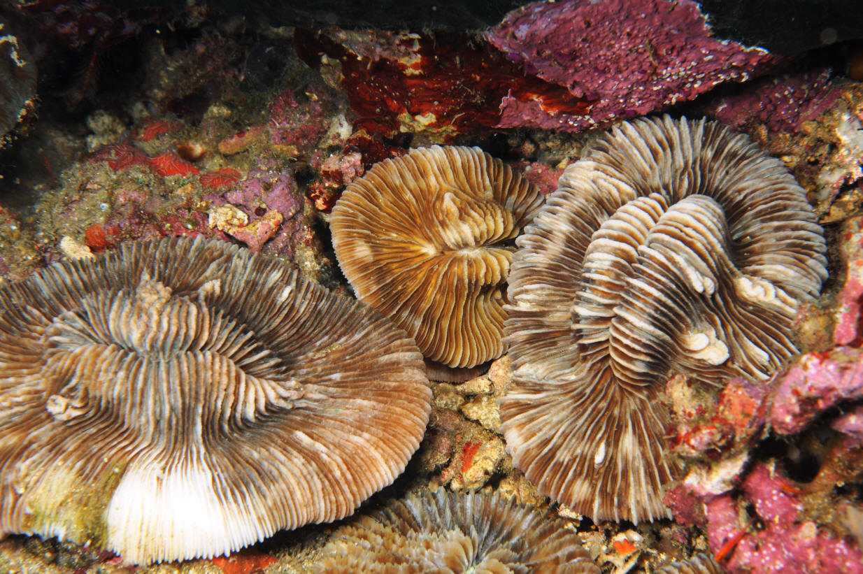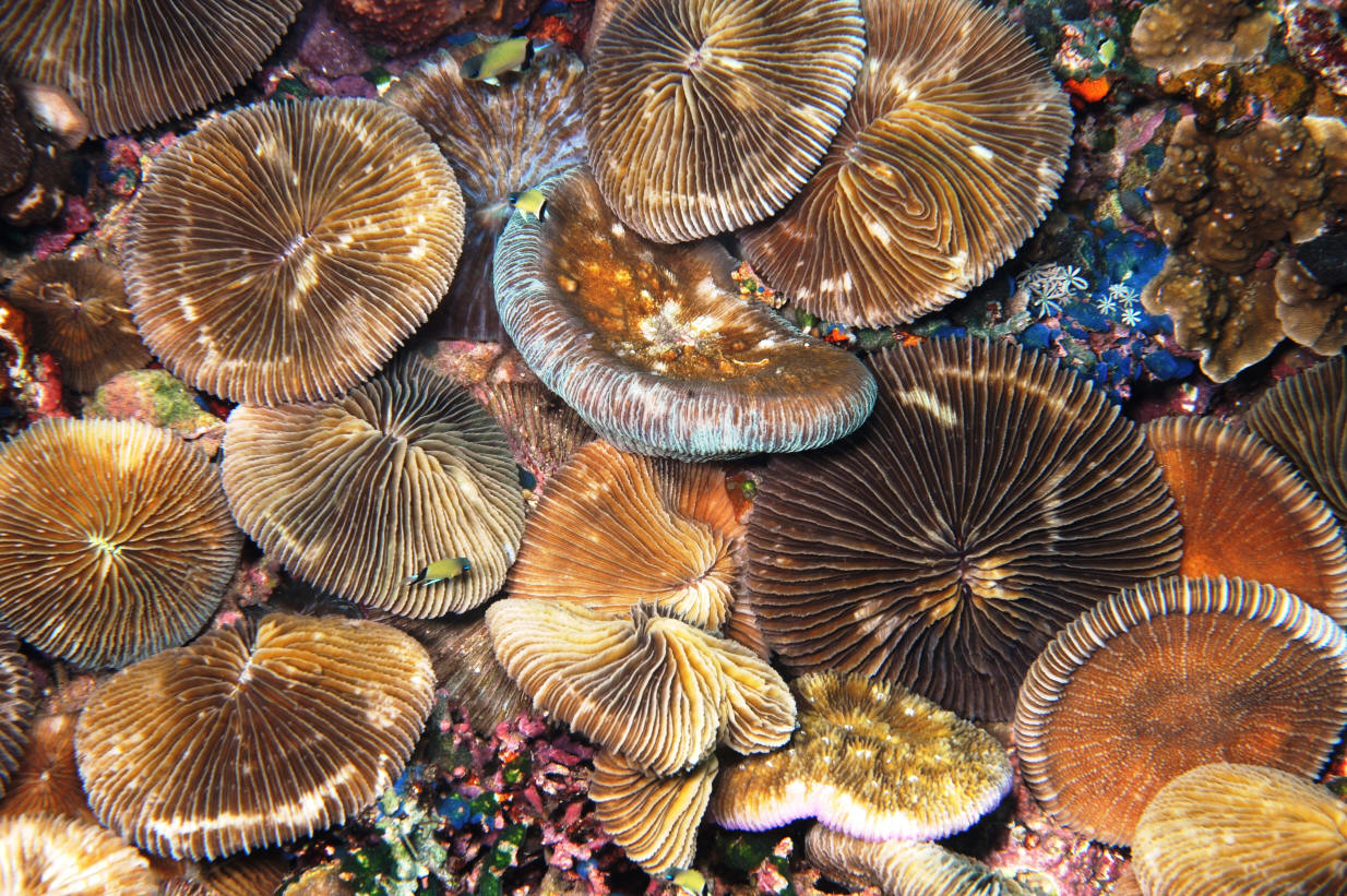 Fungia spp. Here in a typical mix from "falling down" a slope in a jumble. Still alive, and can/will "walk off" in time. S. Leyte 2013