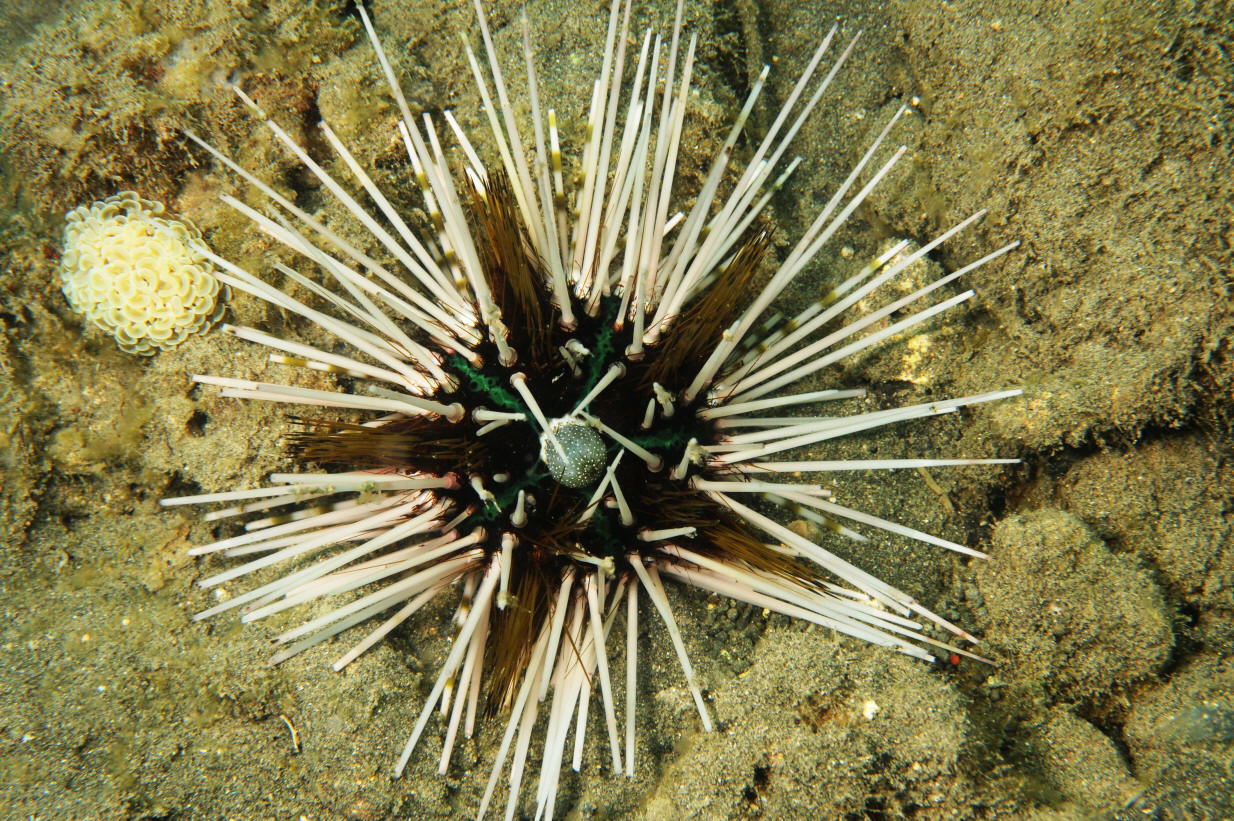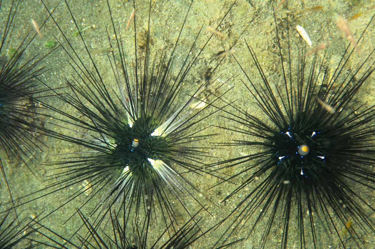 Echinothrix calamaris (Pallas 1774), the Hatpin Urchin. Indo-Pacific; Red Sea to Hawai'i. Should be kept singly and may prey on cnidarian livestock. Need large spaces in rock to hide amongst by day and coarse substrate. Bali 2014