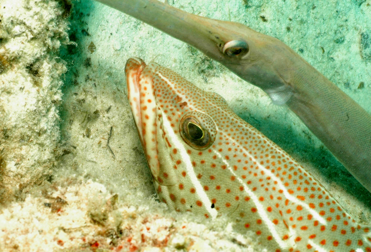 Cruising around together... likely for feeding... an Anyperodon bass and Trumpetfish.   in Malaysia.
